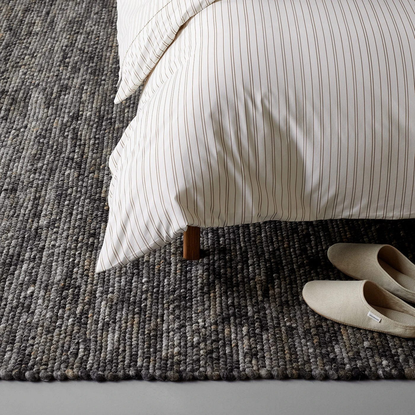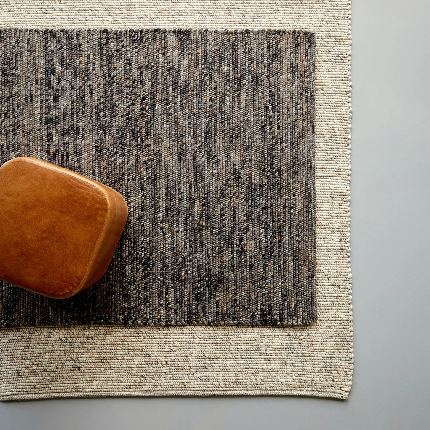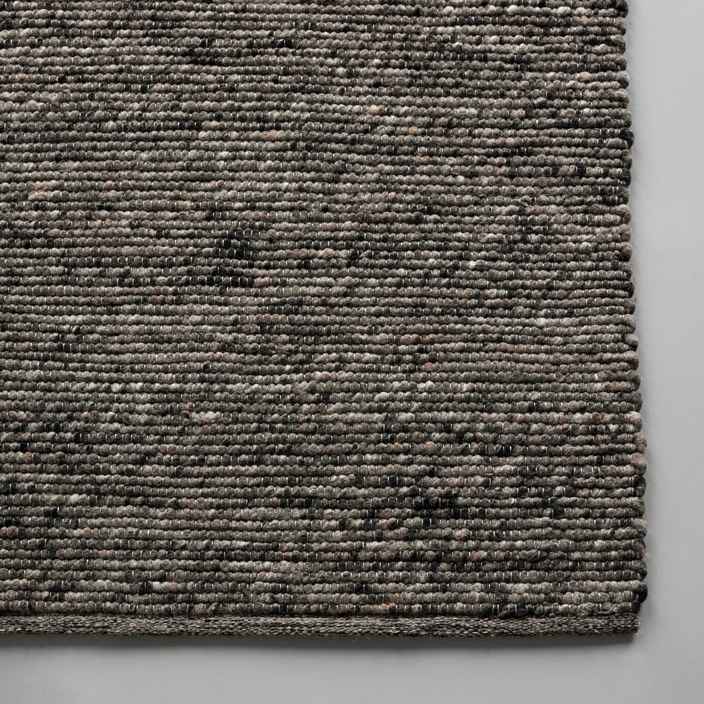 Handwoven using 100% wool, the Agner Charcoal Rug instantly adds a warm feel to hard flooring and helps to create distinct areas within the room. The looped design features slightly visible warp threads and creates a lightly pebbled texture. Variegated dark gray yarns include flecks of various grays and browns along with hints of raw sienna, resulting in a mesmerizing pattern. Finished with self-bound ends, this reversible wool rug offers excellent durability. The various size options are well-suited to range of living rooms, dining rooms and bedrooms.