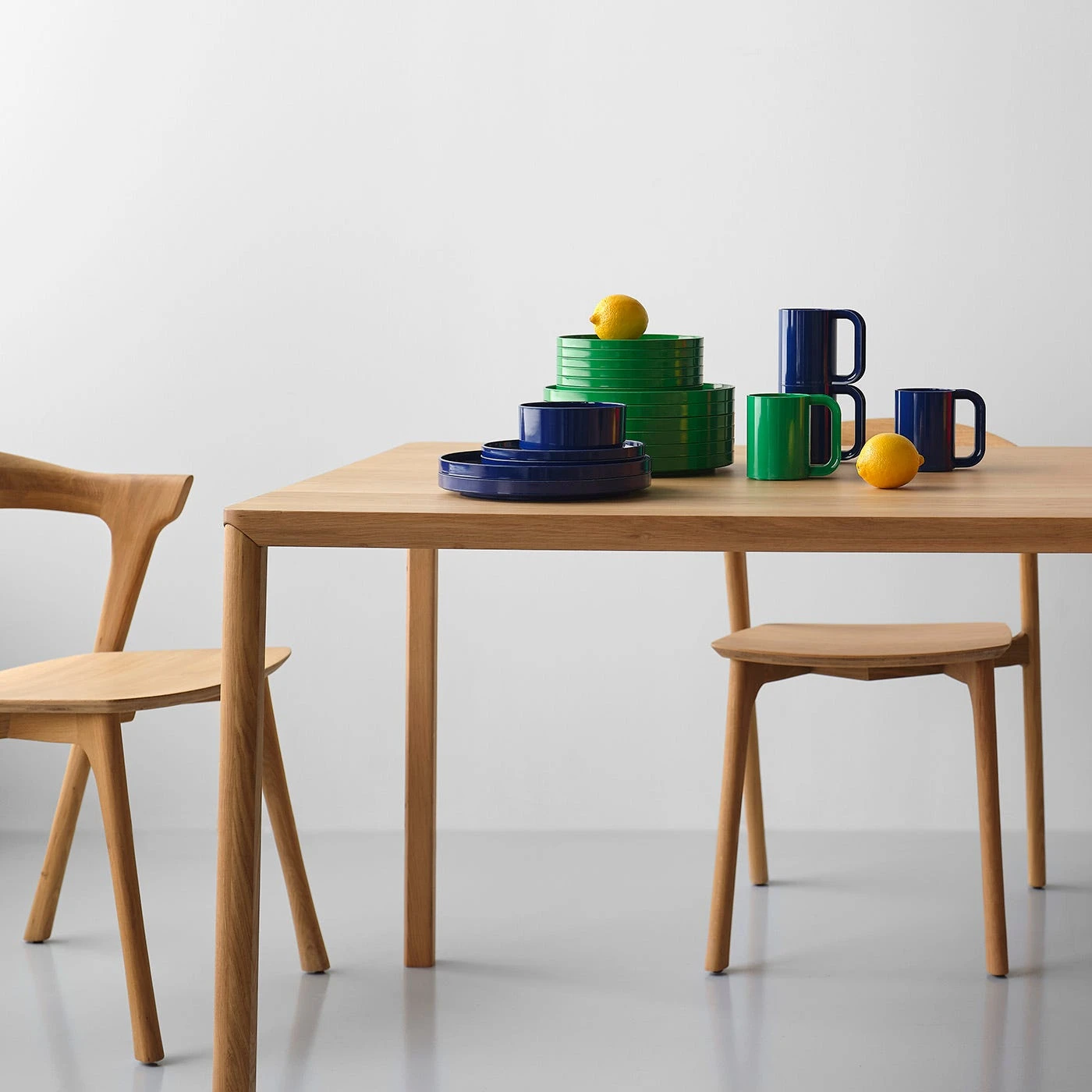 With its simple and slender silhouette, the Air Oak Dining Table has a light and airy look. Its minimalist design is centered on superior craftsmanship, which can be found in subtle details like rounded beveled edges and curved mitered corners at the legs. This piece offers excellent stability and durability thanks to steel rod-reinforced legs. A lightly pigmented matte finish elevates the beauty of the natural grain of the white oak wood, which is harvested from sustainably managed forests. This mid-sized 79-inch oak table seats four or six chairs comfortably.