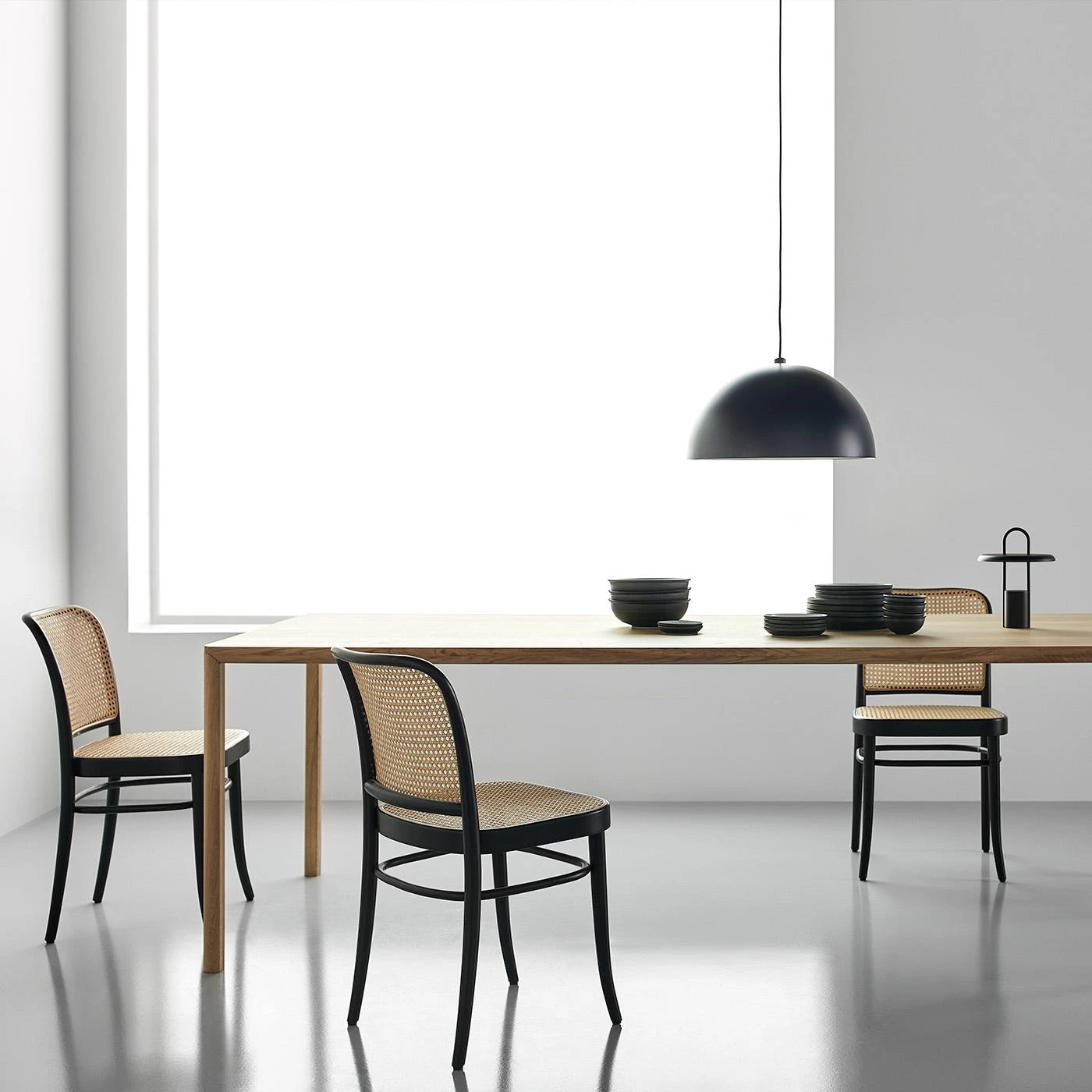 - The tabletop construction consists of white oak 0.6mm veneer that surrounds an inner core of MDF, creating a durable and solid table with a very simple and thin profile.