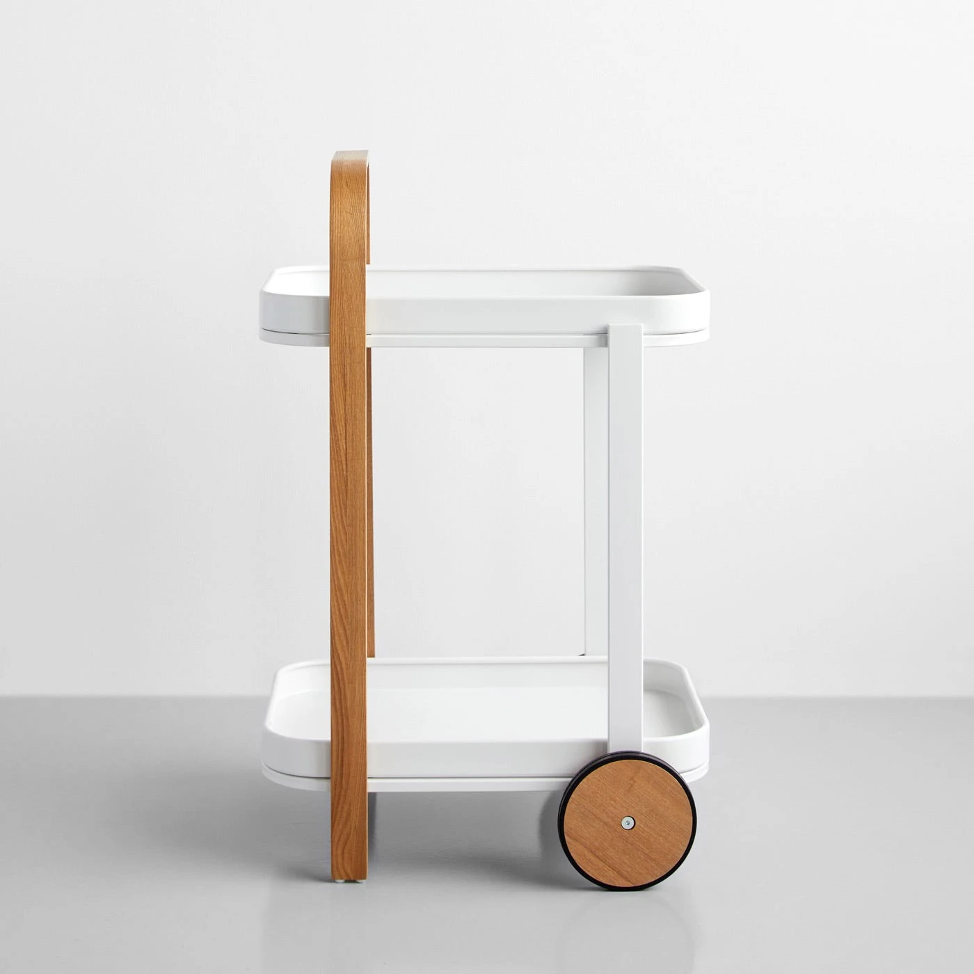 The versatile Bellwood White Cart features a minimalist, two-toned design made from bent plywood and powder-coated steel. The removable trays with rubber feet instantly transform into serving trays and enable easy cleanup. The light-toned wood wheels have rubber rims that glide smoothly and won’t damage floors. This modern white storage cart can serve a number of handy household functions. Load it with beverages and drinkware to create a portable bar or display a collection of indoor plants on the double shelves. It can also be used to organize bathroom toiletries and towels, kitchen gadgets and accessories or arts and crafts supplies.