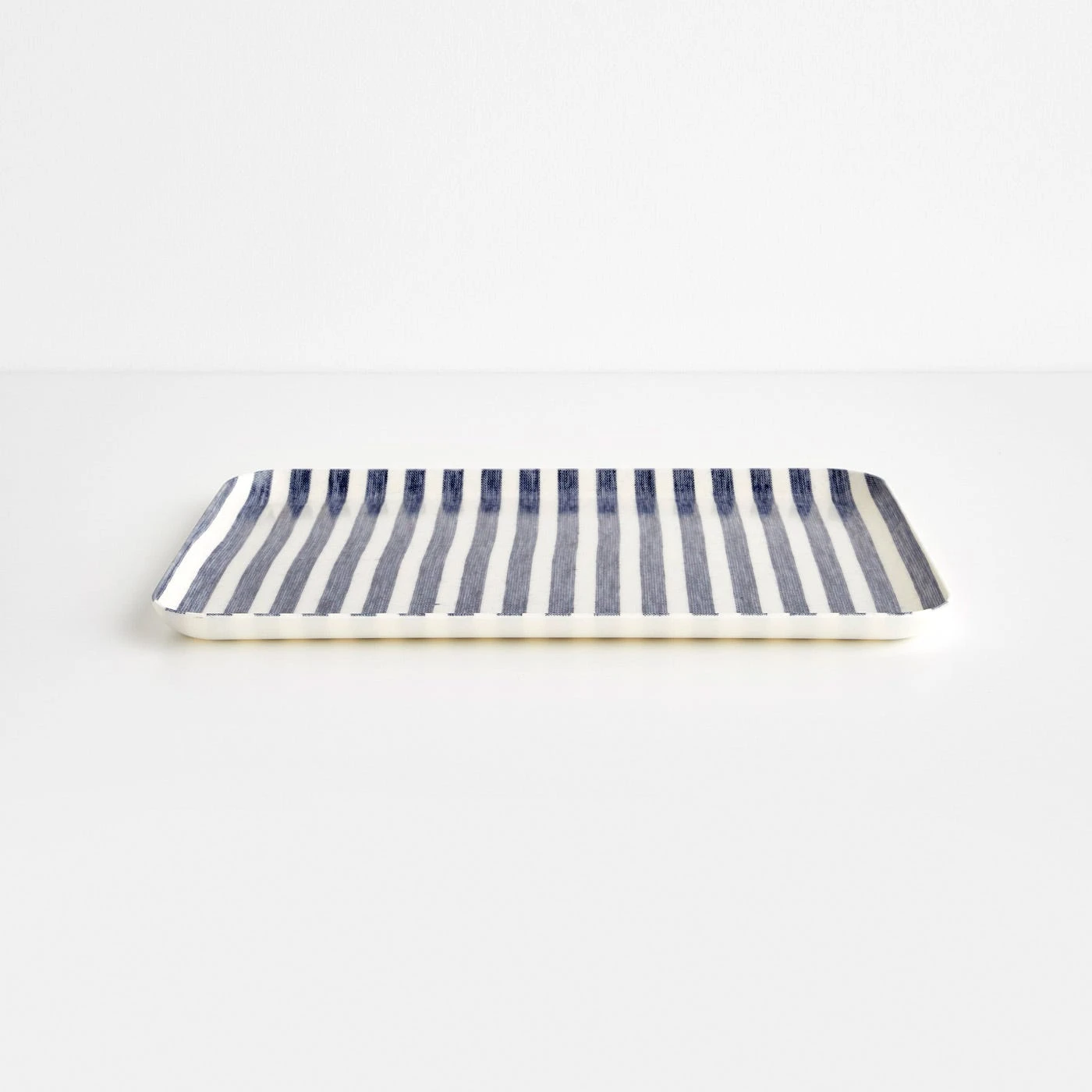 The Bengal Blue Stripe Linen Coated Tray is made in Japan by coating linen fabric with polyester resin. The symmetrical blue and white striped pattern serves as a classic, crisp accent for decorating and entertaining alike. Lightweight yet sturdy, this striped tray features softly rounded corners and a slight lip to keep items in place. The medium tray size is ideal for placing on a coffee table and topping with candles or flowers. The smooth surface can also function as a place to collect keys, wallets, mail and other odds and ends near an entryway.