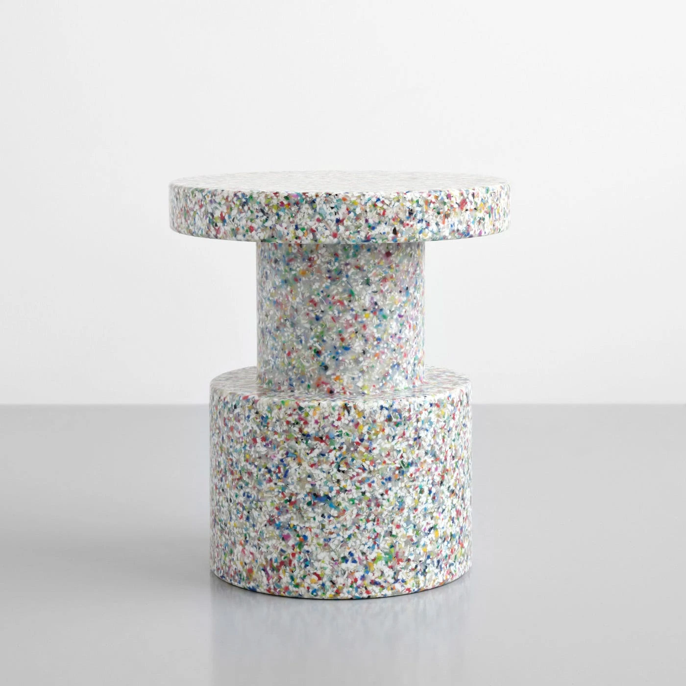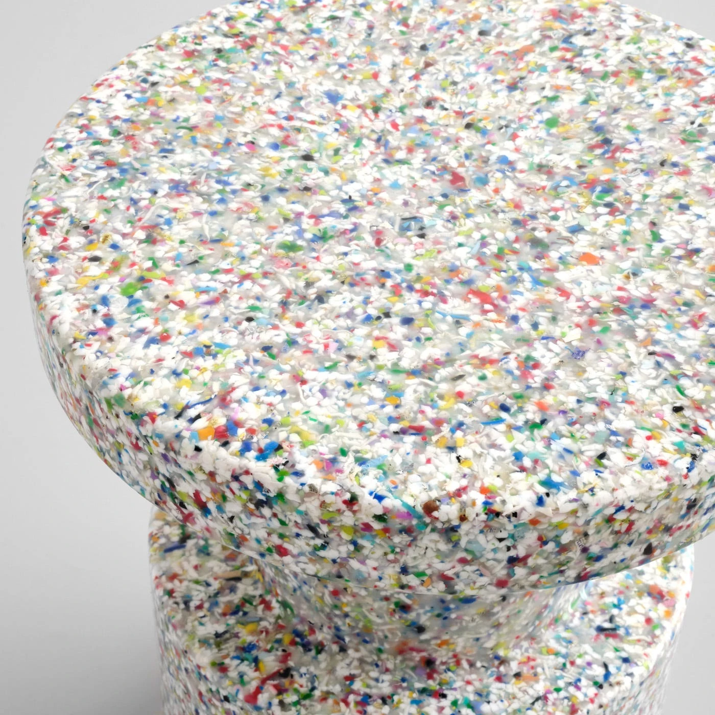 Sculptural, versatile and instantly eye-catching, the Bit White Multi Stool adds a unique accent to any room. This sturdy and solid design is made from recycled plastic fragments from industrial and household waste which are heated and molded into a distinctive shape. Designed by Simon Legald for Normann Copenhagen, the silhouette takes inspiration from the pillars and columns of Greek architecture with a cylindrical bottom and thumbtack-shaped top. Each stool is heavily speckled with white, red, blue, green, yellow, orange and black recycled bits, creating a one-of-a-kind pattern. Suitable for indoor and outdoor use, it can serve as a side table, bath stool, plant stand and more.