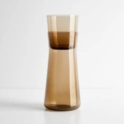 The Bodker Wheat Short Carafe is crafted by artisans in Portland, Oregon using traditional handblown glass techniques. Its minimalist shape is easy to hold and pour, and the earthy, soft brown glass features a subtle ombre effect. The sculptural silhouette is clean, elegant and timelessly modern. Both beautiful and versatile, the carafe can be an attractive pitcher for water, juice and cocktails or a lovely vase. The handblown glass shape also nests together with Bodker’s Classic Short Tumbler for convenient tabletop or bedside service.