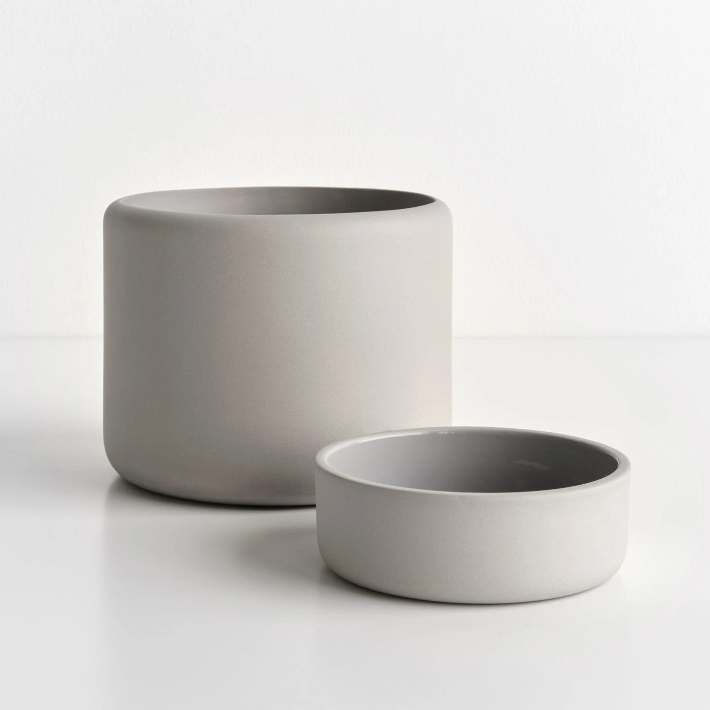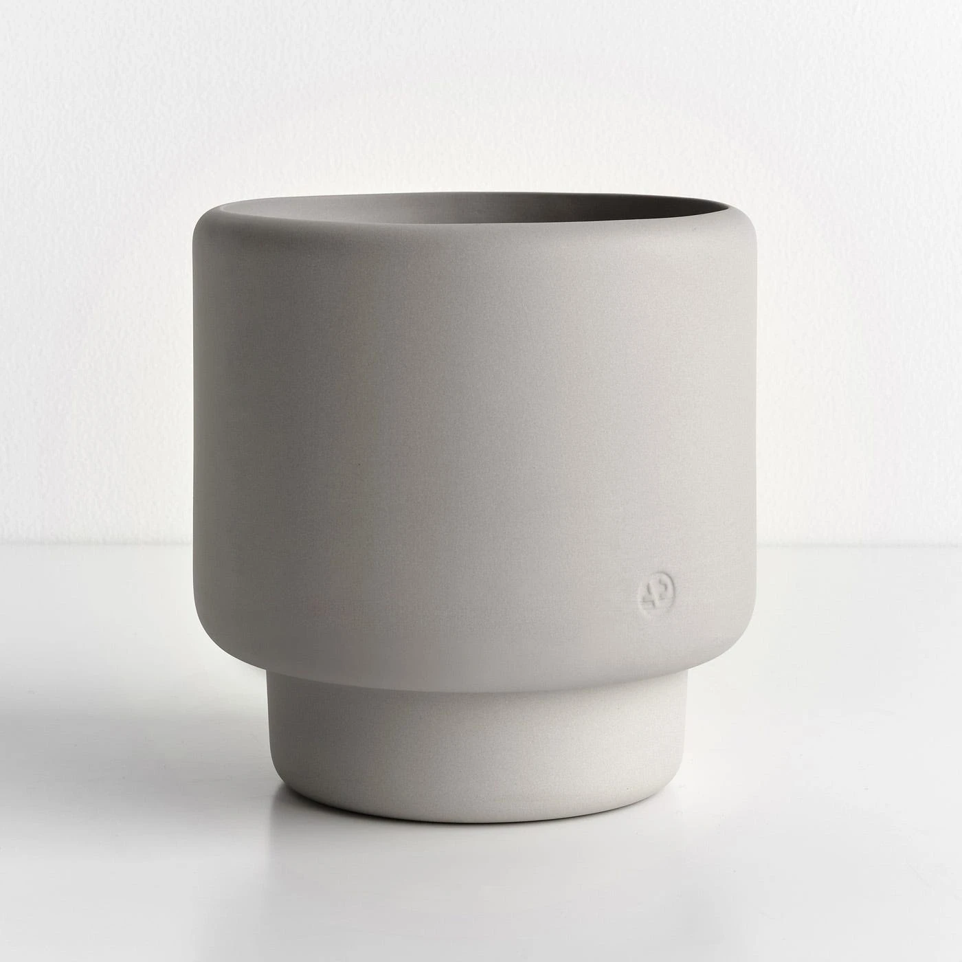 The Botany Concrete Gray Medium Planter complements lush greenery with beautiful design. The rounded shape features a tactile, unglazed finish and a smoothly curved upper rim. Designed by Aaron Probyn, this light gray planter is expertly hand slip cast from colored porcelain, which helps to achieve a rich, cool-toned hue. The two-part design creates a distinctive tiered style while also adding functionality. The lower portion serves as a saucer to allow proper drainage and protect surfaces from drips. Suitable for indoor or outdoor use, this versatile planter comes from an award-winning design studio focused on eco-friendly practices.
