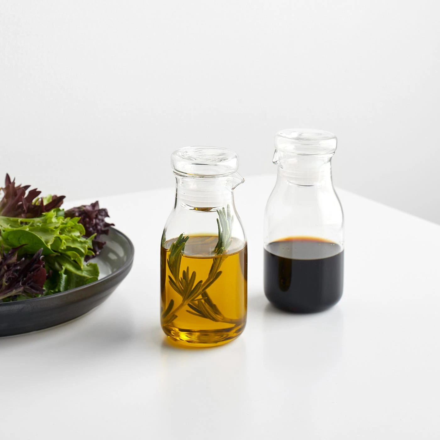 The Bottlit Dressing Bottle adds a refined touch to everyday dining. With a 5-ounce capacity, this small bottle has a convenient spout for dispensing creamer or milk for your morning coffee, adding a touch of honey to your tea, or pouring ice-cold milk over your cereal. The clear design makes it easy to view what’s inside and how much is left. Made from durable borosilicate glass, this bottle is especially durable and conveniently microwave and dishwasher-safe. The glass lid’s silicone ring creates an airtight seal, keeping the contents securely inside and fresh.