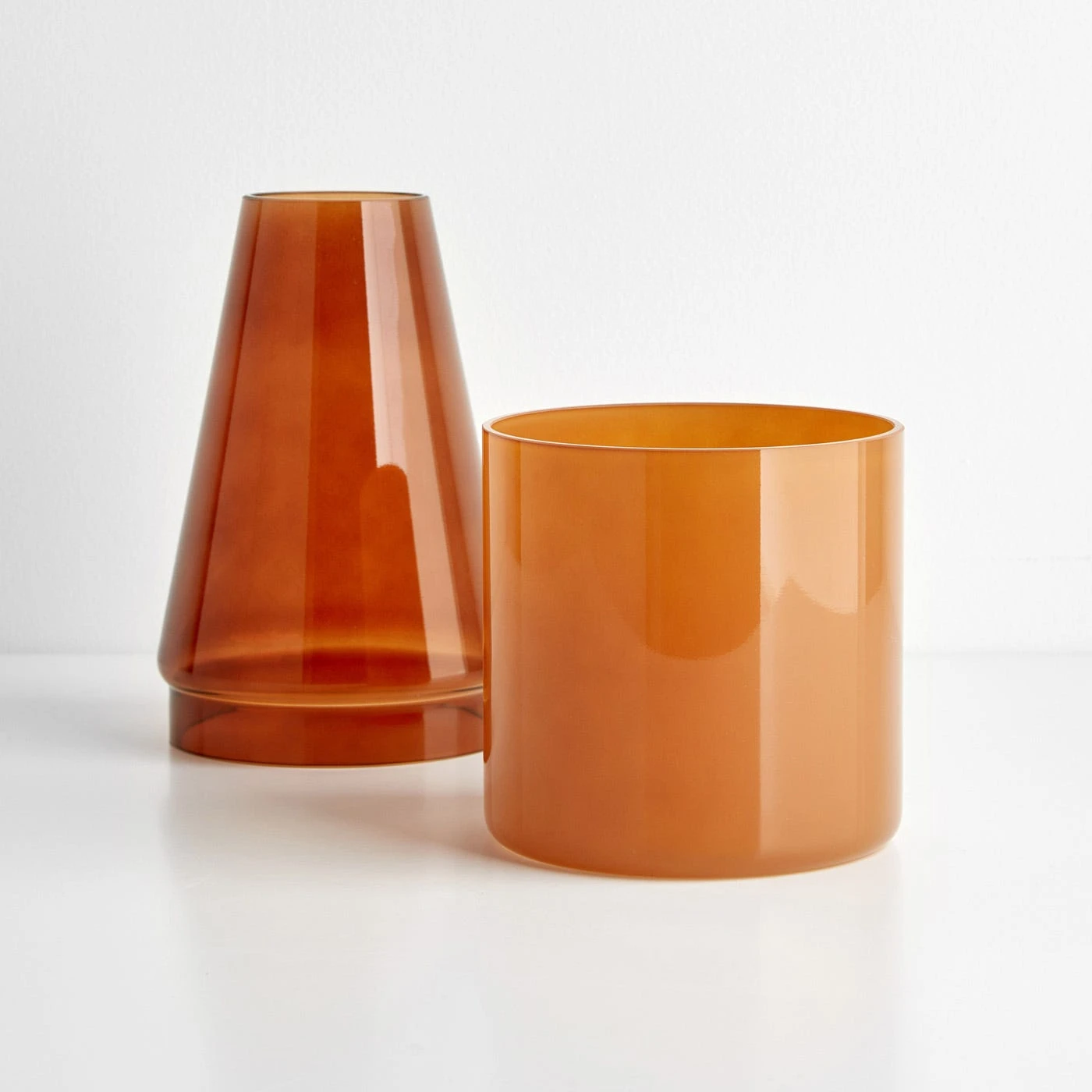 The Broste Copenhagen Georg Amber Glass Vase features a distinctive, two-part design. With its complementary transparent and opaque finishes and a sculptural silhouette, this deep orange vase provides an equal level of visual interest as the blooms or greenery it holds. Its angular shape allows the vase to serve as an attractive decorative accent even when empty. The handblown glass form features a classic cylinder base with a conical top that gathers stems into a dense, lush bouquet. The upper portion is removable, allowing for smaller flower displays.
