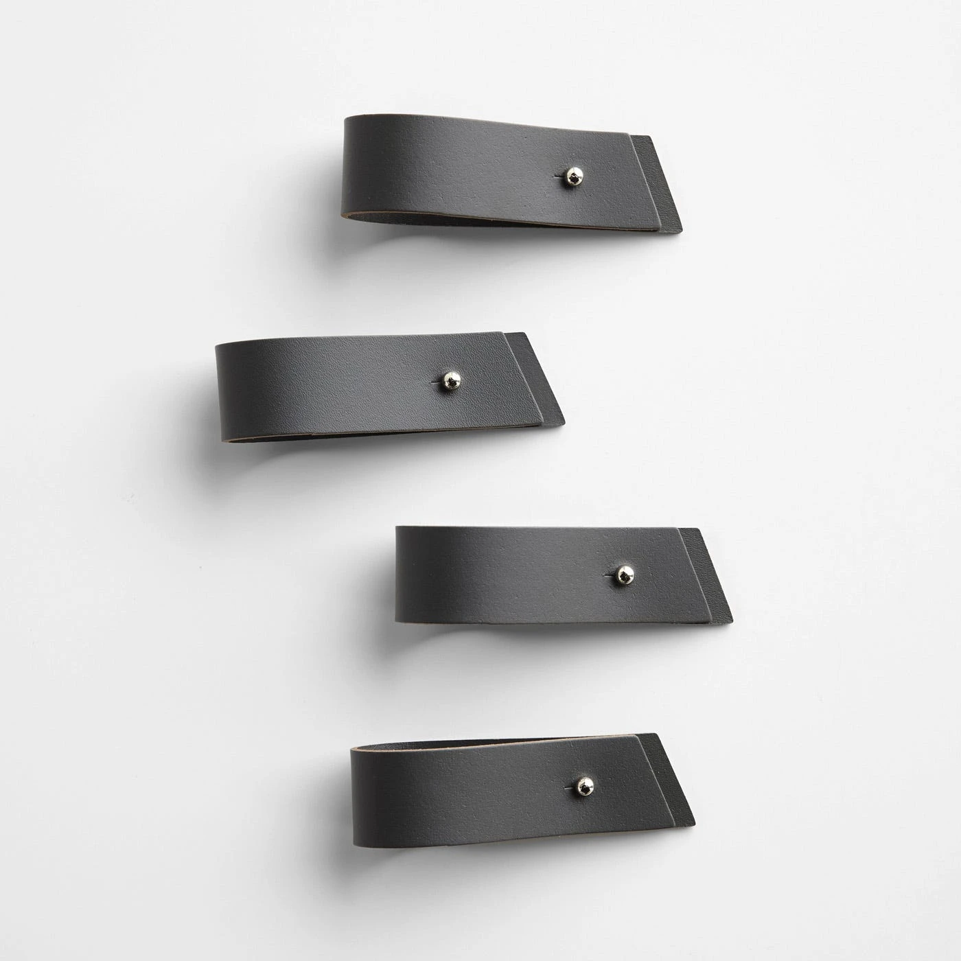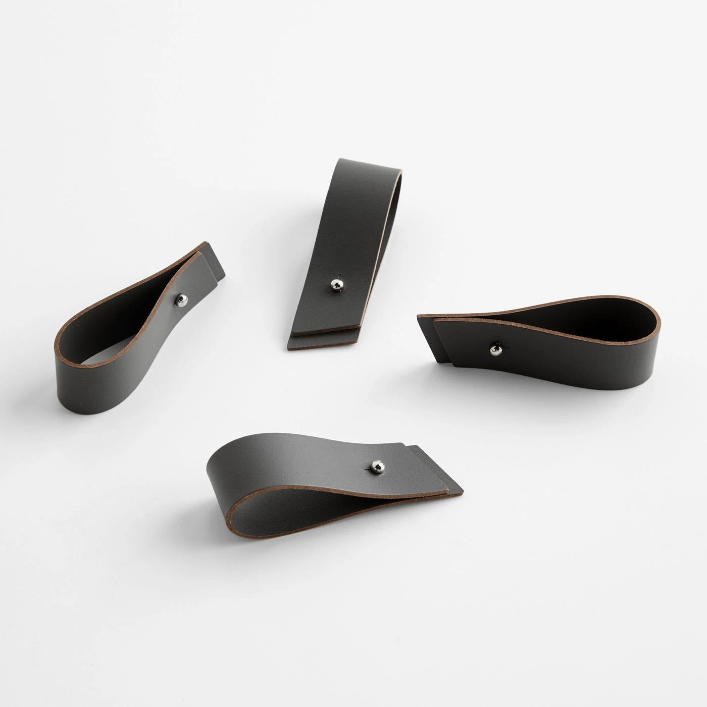 Add a refined accent to your dining table with these Charcoal Leather Napkin Holders in a classic gunmetal gray hue. Each of the four bands in the set are handcrafted using 100% recycled leather, which is made by cleaning, compressing and bonding discarded leather straps. The result is a sustainable material with a uniform, easy-to-clean surface. A metal value-post closure makes it simple to secure and release cloth napkins as needed. Use these gray napkin rings to make everyday meals and dinner parties alike feel special.