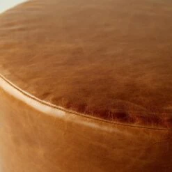 With its timeless round shape and high-quality materials, the Cylinder Cognac Leather Ottoman adds a distinguished touch to any room. Benchmade in North Carolina, this piece features an expertly crafted kiln-dried solid maple wood frame. The smooth, soft aniline leather is dyed to retain its natural color variations and markings and will develop a beautiful patina over time. The rich color is paired with plain seam stitching for a clean, minimal look. CertiPUR foam, which meets rigorous safety and performance standards, adds comfortable padding. Use this brown leather ottoman as a footrest, an extra seat, or top with a tray to create a functional coffee table.