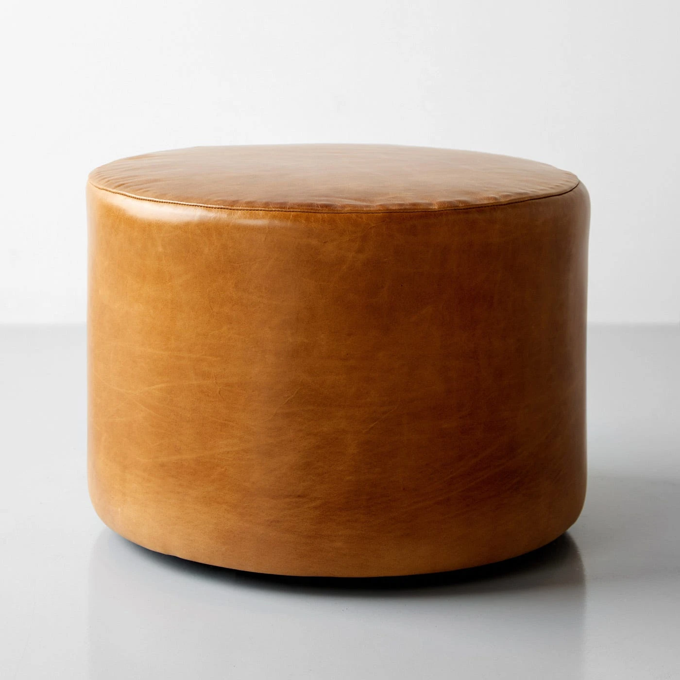 With its timeless round shape and high-quality materials, the Cylinder Cognac Leather Ottoman adds a distinguished touch to any room. Benchmade in North Carolina, this piece features an expertly crafted kiln-dried solid maple wood frame. The smooth, soft aniline leather is dyed to retain its natural color variations and markings and will develop a beautiful patina over time. The rich color is paired with plain seam stitching for a clean, minimal look. CertiPUR foam, which meets rigorous safety and performance standards, adds comfortable padding. Use this brown leather ottoman as a footrest, an extra seat, or top with a tray to create a functional coffee table.