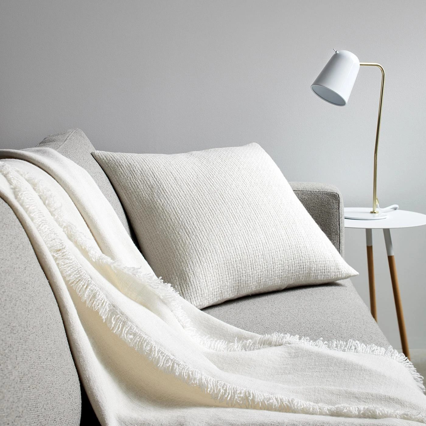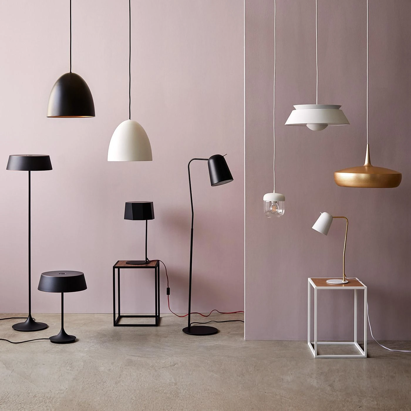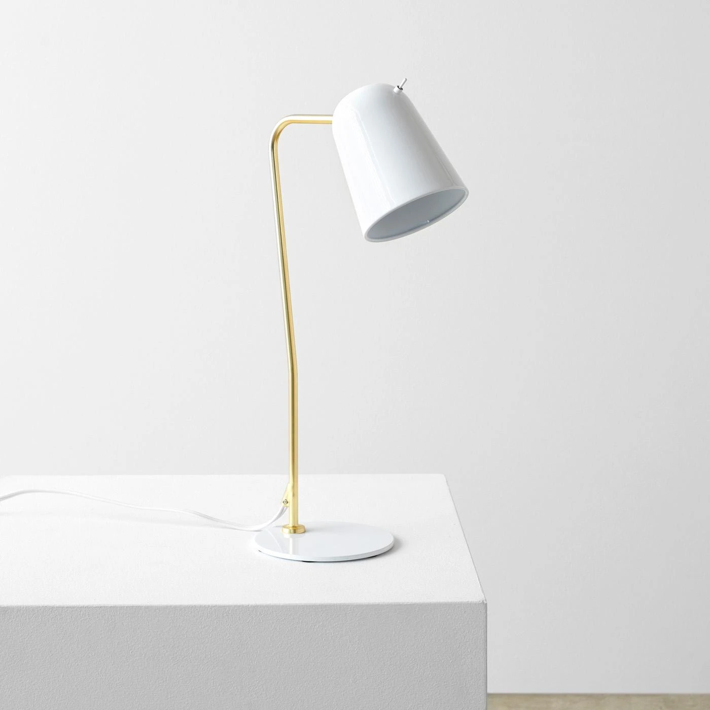- Steel with gloss white finish shade and base, steel with matte brass finished arm, white PVC cord.