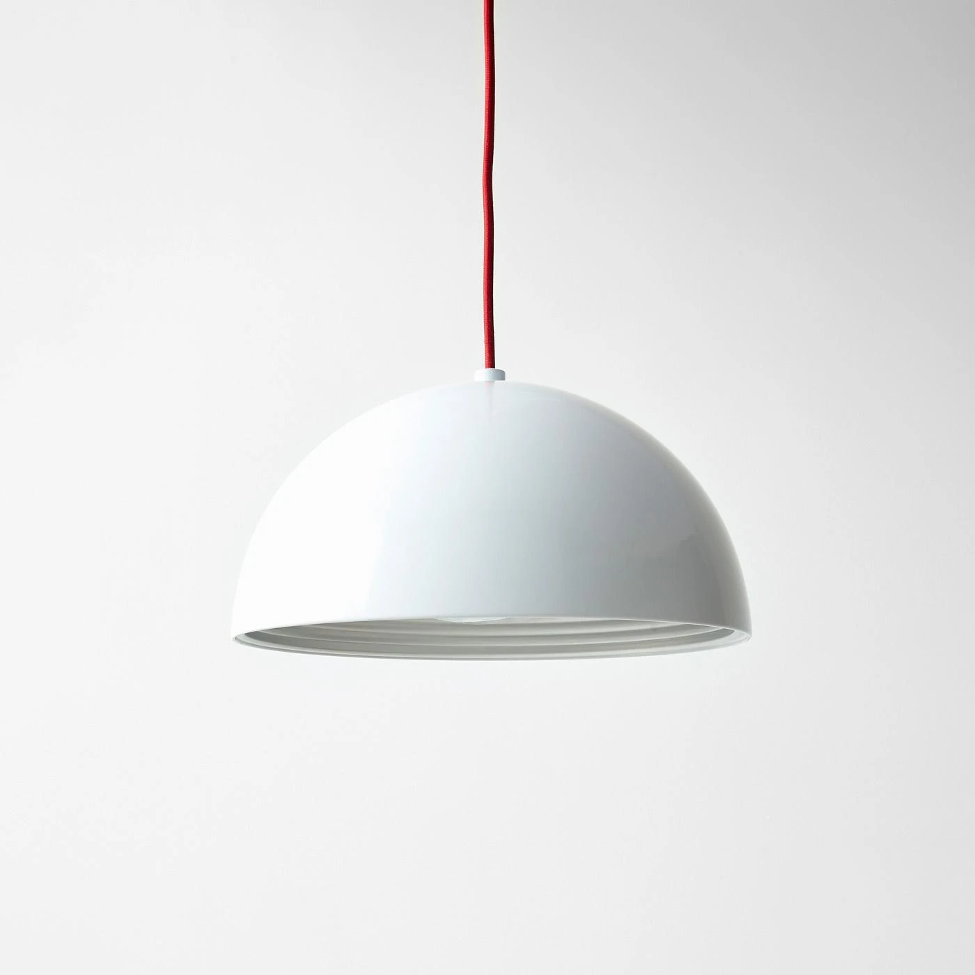 Add a sense of modern industrialism to your space with the Dome White Medium Pendant Lamp. This light fixture creates a statement with its bold size and clean lines that are both contemporary and timeless. The oversized matte white steel shade has a centric-circled aluminum reflector and bulb cover that control light and prevent glare, creating a warm glow that is easy on the eye. A red fabric cord adds the perfect colored accent to the otherwise all white fixture. Install one over a table or in an entryway to create a defined focal point, or hang a pair over the kitchen island, or flanked by the bed, the Dome White Medium Pendant Lamp adds emphasis to every space.