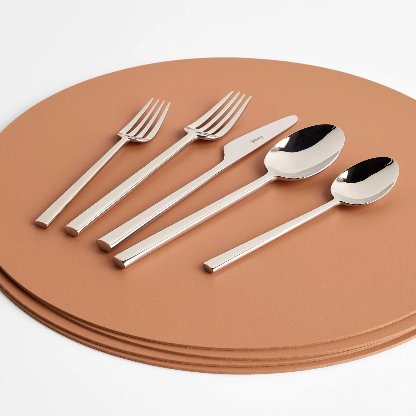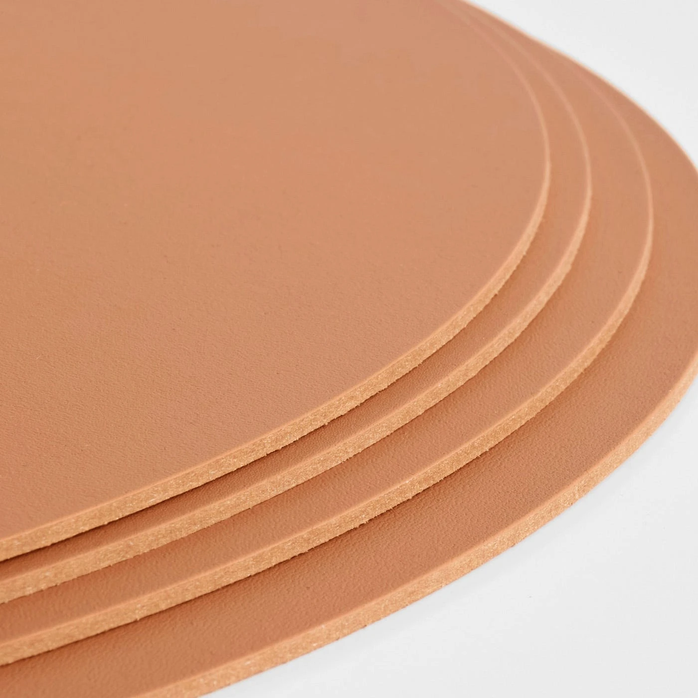 Accent your table using round placemats designed with the planet in mind. Crafted in Spain, the Dot Clay Round Leather Placemat is made with 100% recycled leather. Scraps that would normally be discarded by the leather industry are recovered, cleaned and compacted. Latex and other natural fibers are used for binding, creating a material that’s uniform, easy to clean and as durable as regular leather. The timeless light brown color lends an organic warmth to your table setting. Pair with matching Dot Leather Coasters and Leather Napkin Holders.