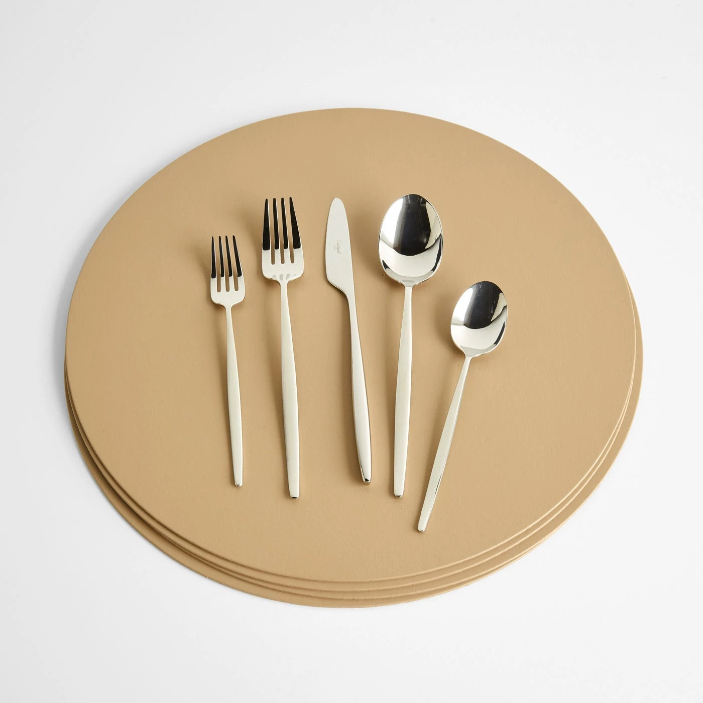 Things come full circle with these recycled leather placemats, crafted in Spain. In the production process of this material, off-cuts discarded by the leather industry are given a second life. These scraps are recovered, cleaned, compacted and bonded with latex and other natural fibers before being transformed into a new sustainable and environmentally-friendly material of the same durability as regular leather. Show off your dinnerware and a delicious meal with the neutral sand leather placemat.
