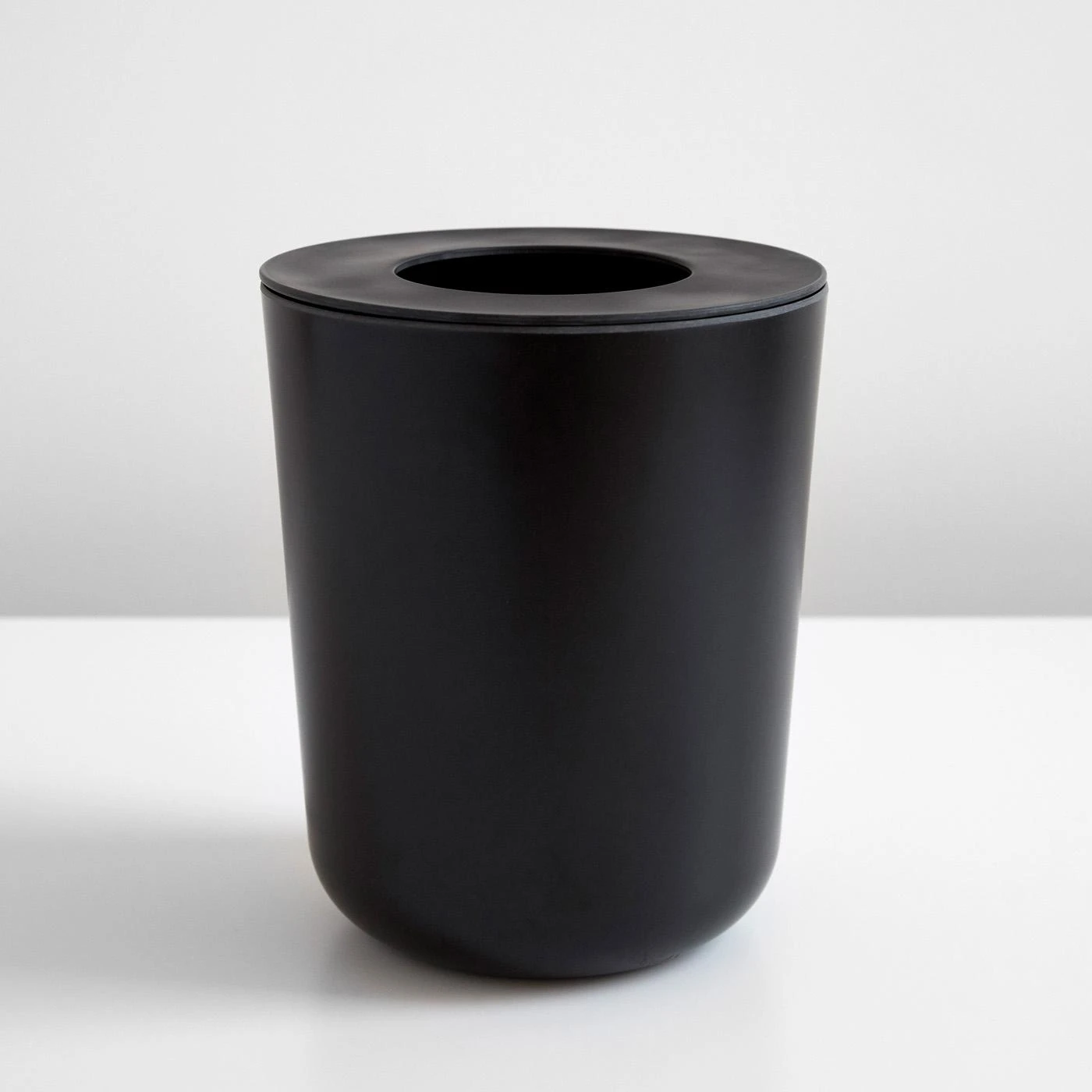 Keep waste out of sight. Keep clean design within your reach. This tasteful trash container has a two-part design, with a lid that hides what’s inside. Its best-kept secret? It’s made from renewable, biodegradable bamboo. In bold black, finished to look satiny smooth, it’s an accent piece in its own right.