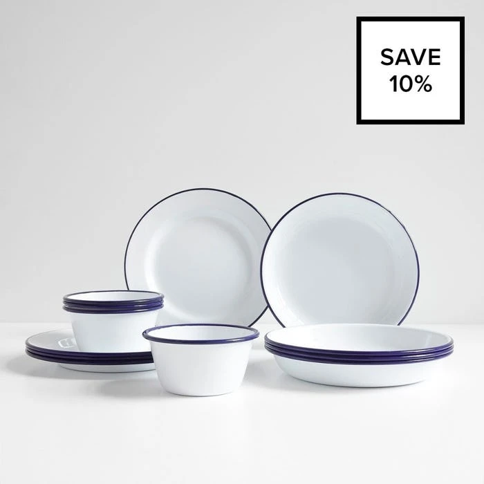 Come pull up a chair at the table where casual chic is as effortless as it is distinctive. Falcon Enamelware has been an icon of British home life since the 1920s, and with good reason. The porcelain enamel coating is fused onto heavy-gauge steel to deliver enduring strength and smoothness. Plus, it’s dishwasher-safe and oven-safe up to 530 degrees Fahrenheit. Not to mention that the classic design of ice white with a blue rim is casual elegance at its best. The final result: a look that reflects iconic British design and iconic mod, no matter the continent. A 10% set discount is applied for purchasing the 12 piece bundle.