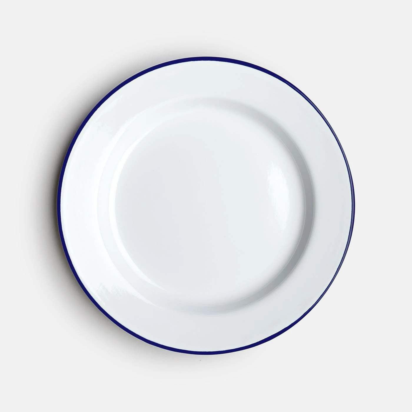 Falcon Enamelware has been an icon of British home life since the 1920s and continues to be a dinnerware staple today. These designs are notable for their porcelain enamel coating that is fused onto heavy-gauge steel to deliver enduring strength, smoothness and chemical resistance. The Falcon White Enamelware Plates feature a blue rim that contrasts the crisp white interior, a classic color combination that is made to last.