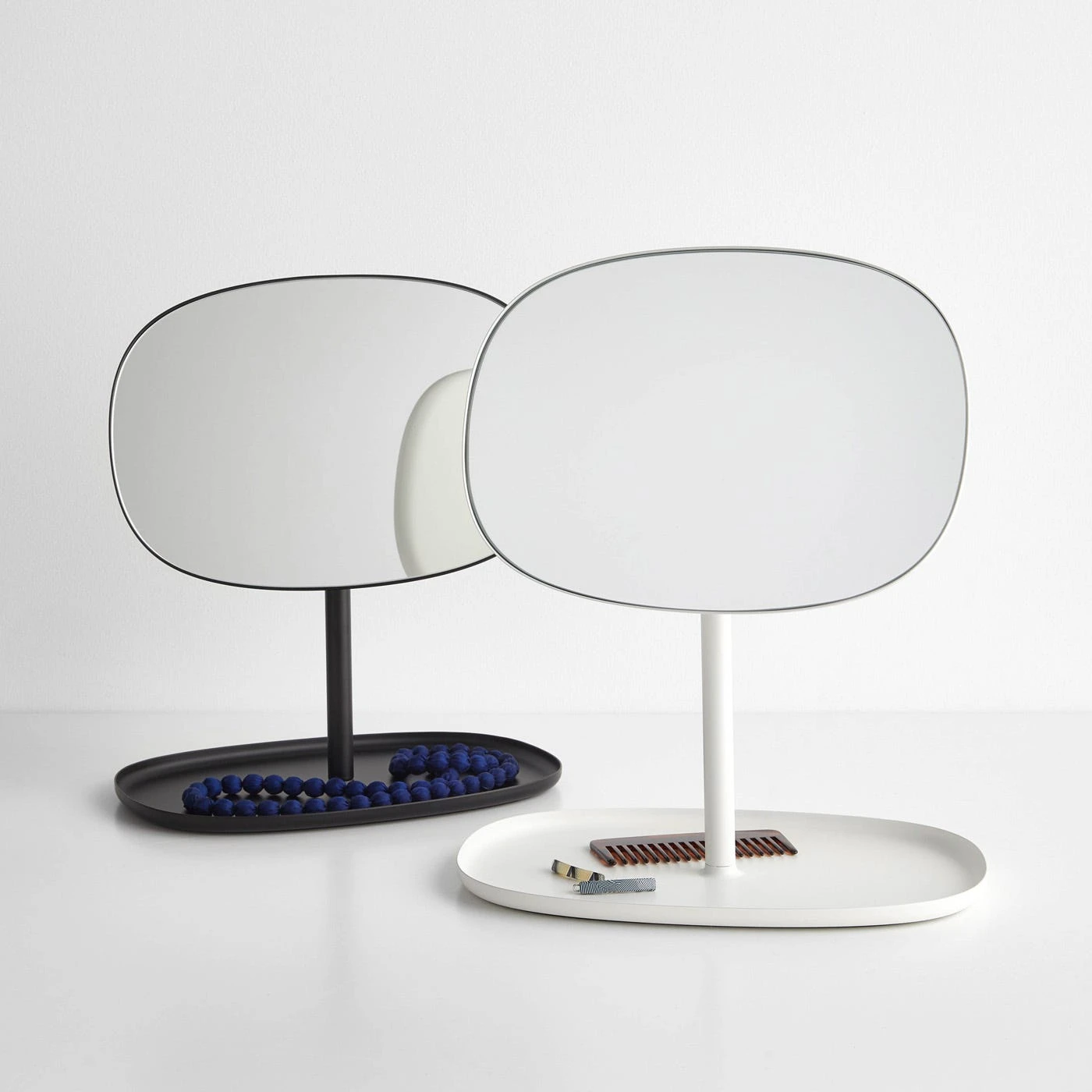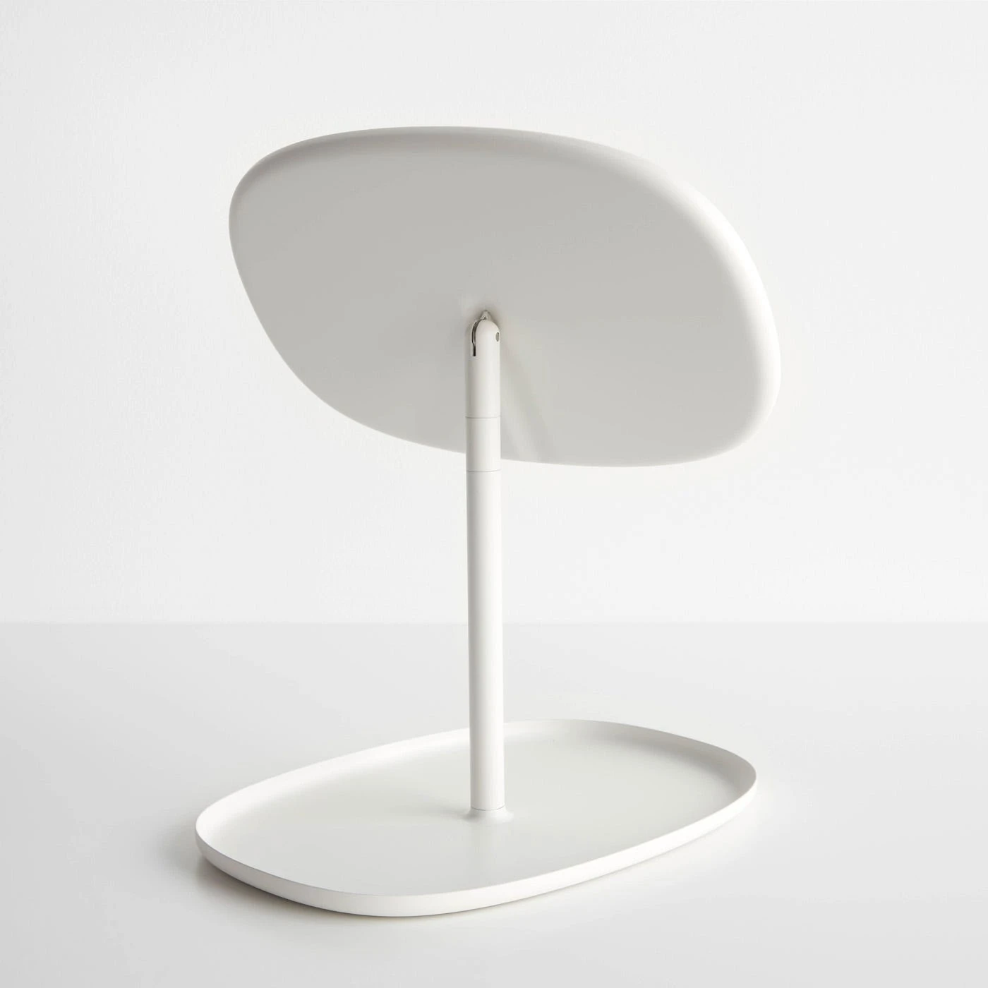 The Flip Mirror’s attractive and functional design makes it an endlessly versatile accessory for the home. An adjustable head allows you to achieve the ideal angle for viewing. Perfect for placing on bathroom countertops, bedroom dressers or entryway tables, the mirror is paired with a simple tray that serves as a balanced base and a convenient spot to store jewelry, keys, coins and other small items. Organic forms add a softness to this mirror made from sturdy steel and glass. A powder-coated finish in a crisp white tone gives this charming piece an airy, minimalist appearance.