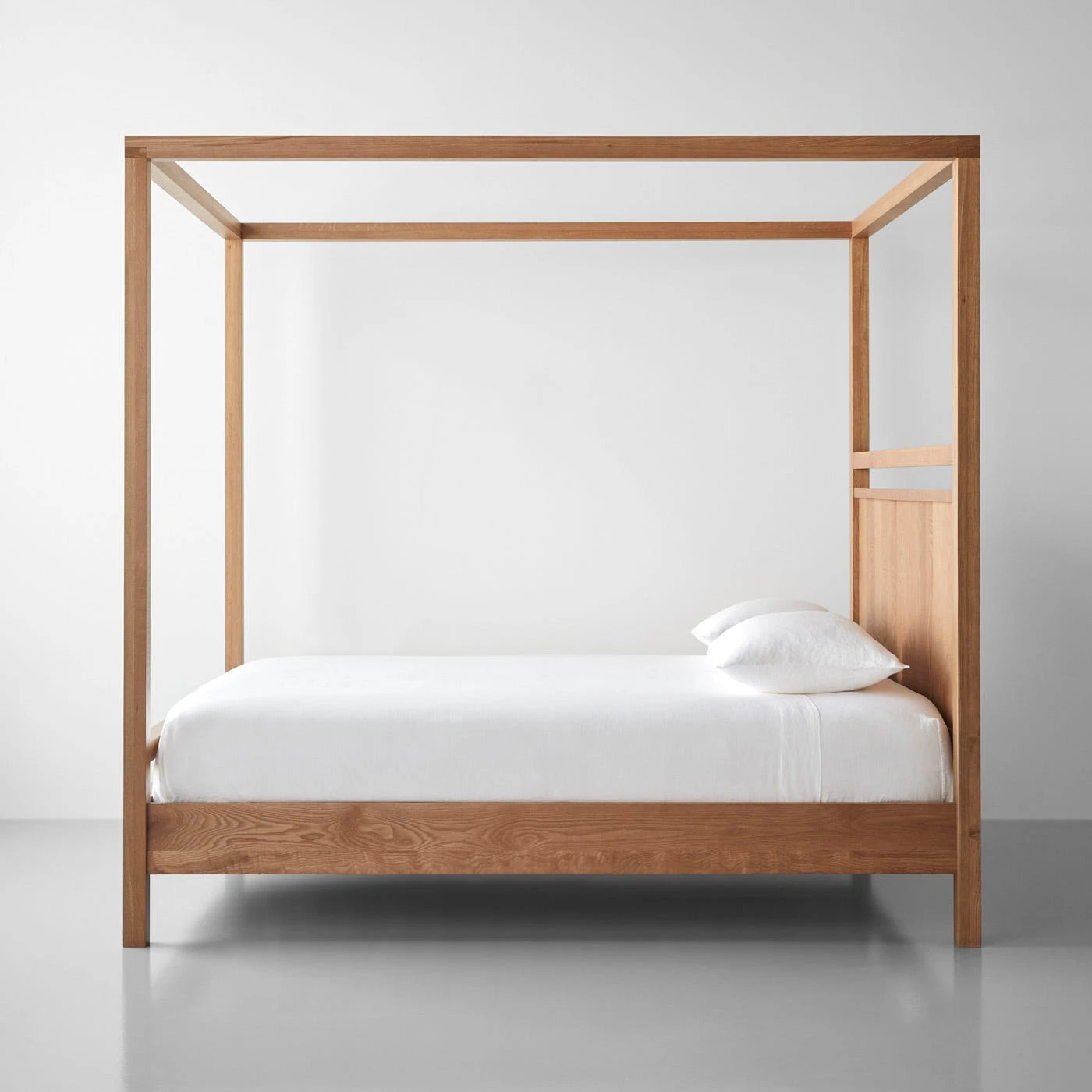 - Solid white oak canopy rails, white oak veneer over maple substrate footboard inset panel and side rails, solid oak footboard and headboard legs and frame, white oak veneer over plywood substrate headboard inset panel and solid maple slats.