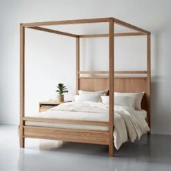 Bold yet minimal, this solid white oak canopy bed makes a dramatic impact on any bedroom. Handcrafted in Canada by a company that’s been sustainably producing furniture for over twenty years, this bed is built to last. The low sheen lacquer finish highlight the natural beauty of the wood. With no need for a box spring, the platform style canopy bed maximizes clean lines and subtle details. Make your bed the vibrant centerpiece your bedroom deserves with this four poster canopy bed.