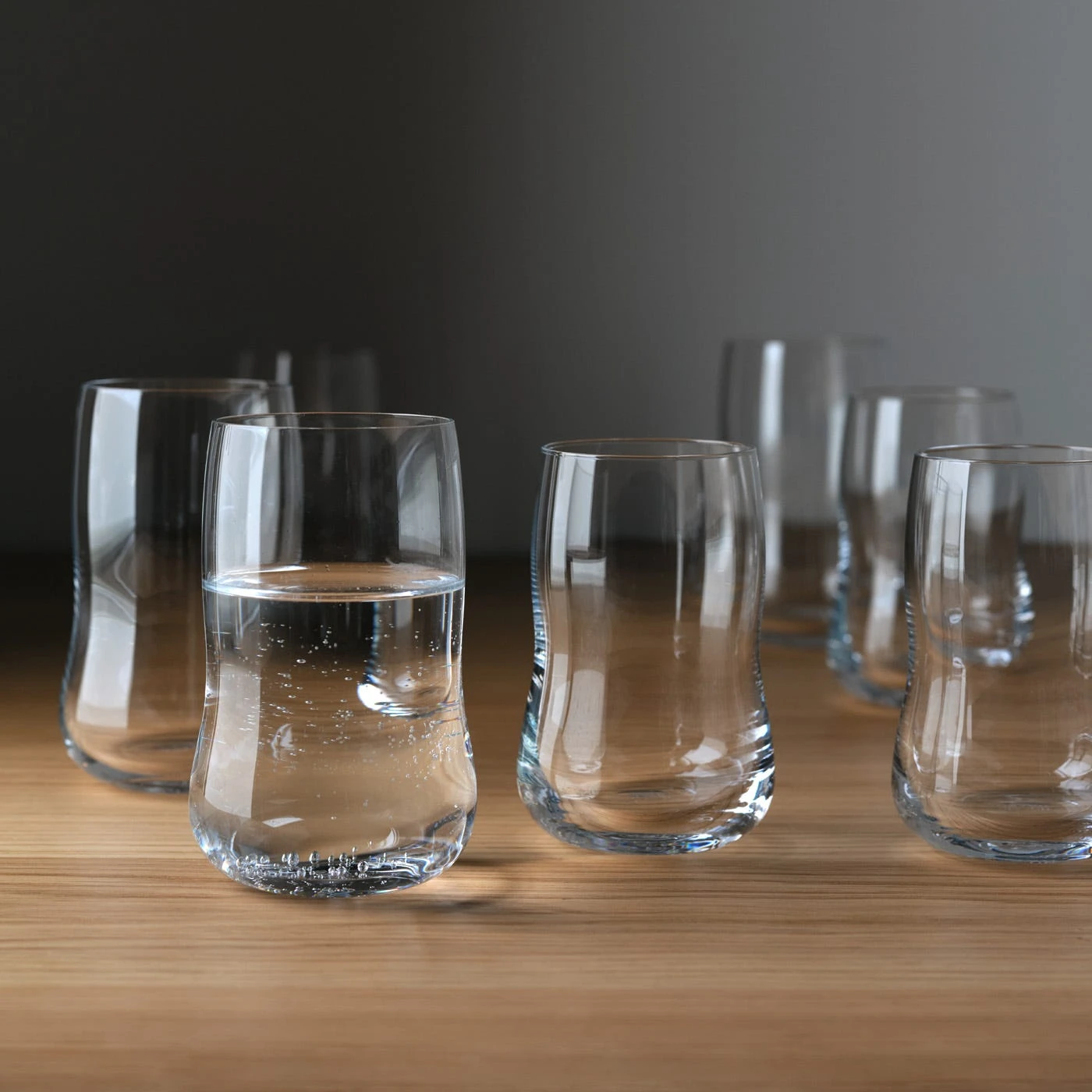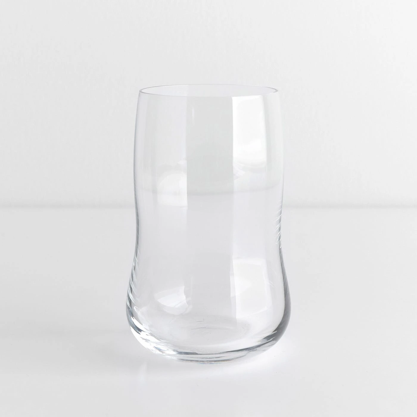 The Future Tumbler was designed by Peter Svarrer for Holmegaard, an icon of Danish design. Created for an exhibition about the future, these crystal-clear drinking glasses were made to complement table settings for a Japanese food concept. The simple, modern style emphasizes a smooth, organic shape with soft curves that nestle comfortably into the palm of the hand and the wider bottom provides added stability. This 12.5-ounce tumbler is perfectly sized for water, soda, cocktails and beer.