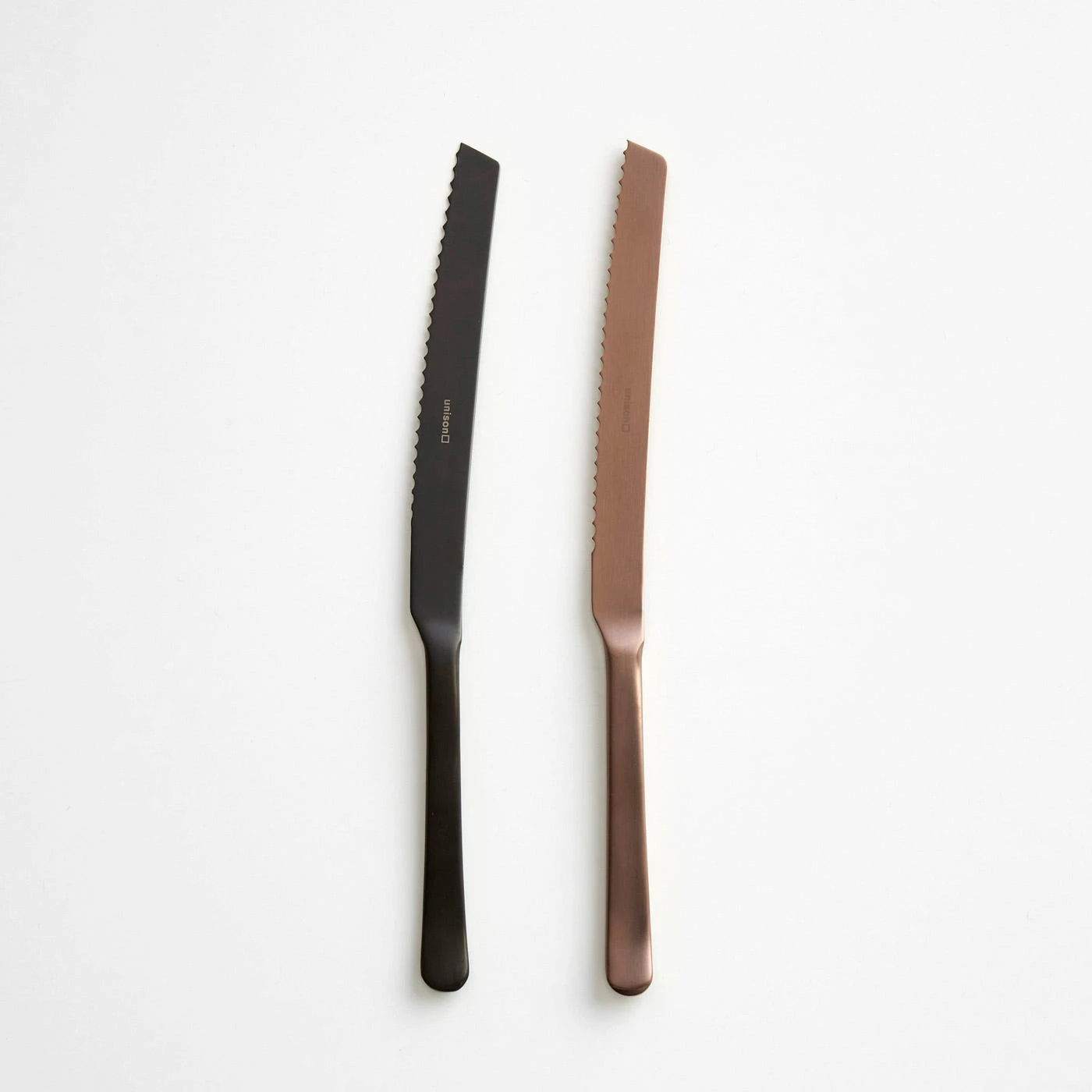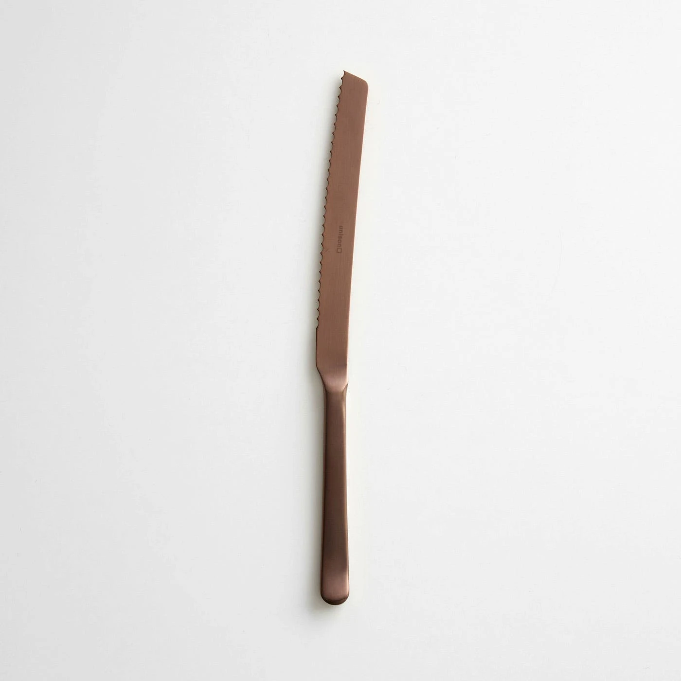 This knife makes a style statement that might be the best thing since sliced bread. Designed in Portugal, giving top priority to design, elegance, and functionality. And this bread knife is no exception. With a sharp silhouette and gently luminous matte copper finish laid atop strong, electro-plated 18/10 stainless steel, this is a testament to stylish strength, any way you slice it.