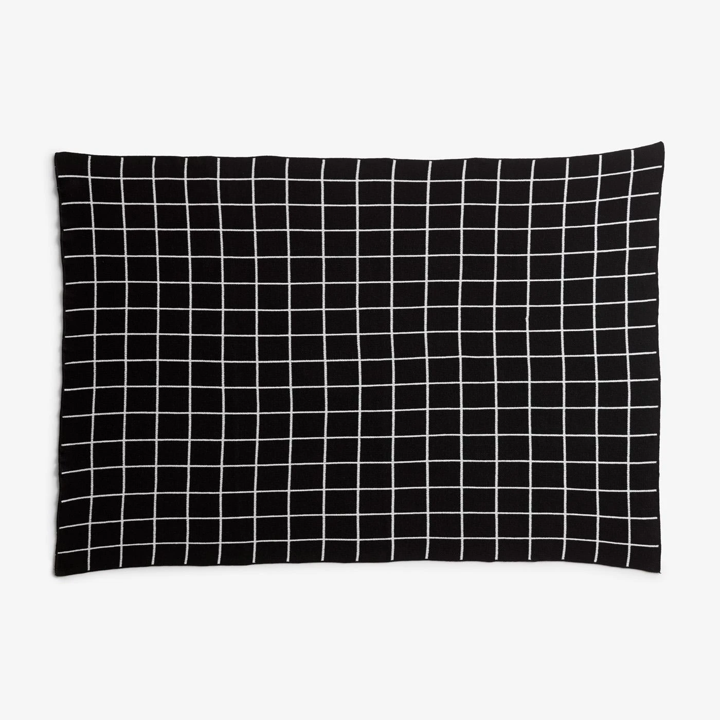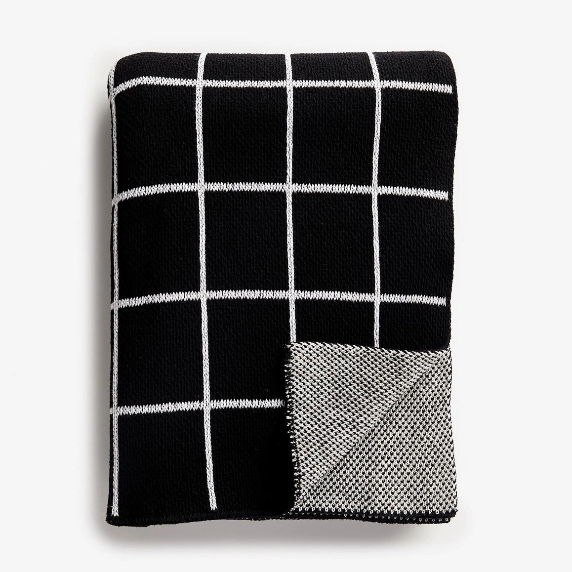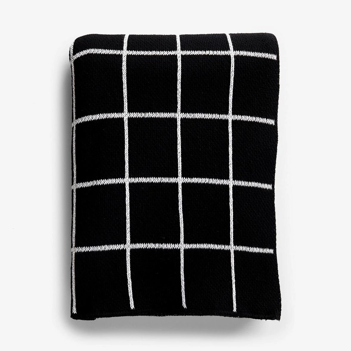 A strong and modern motif in black and white, this recycled cotton and polyester blanket makes a graphic statement in any interior. This double-knit throw has a sweater like texture that is both weighty and warm, adding a comfortable and attractive accent to the home. Featuring a signature Unison grid pattern, and produced by a fourth-generation family owned textile manufacturer, the Grid Black Knit Throw Blanket is both designed and produced in the USA.