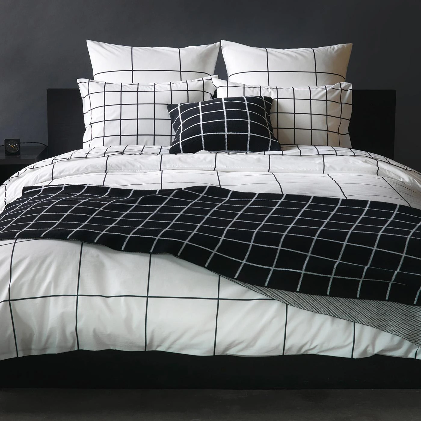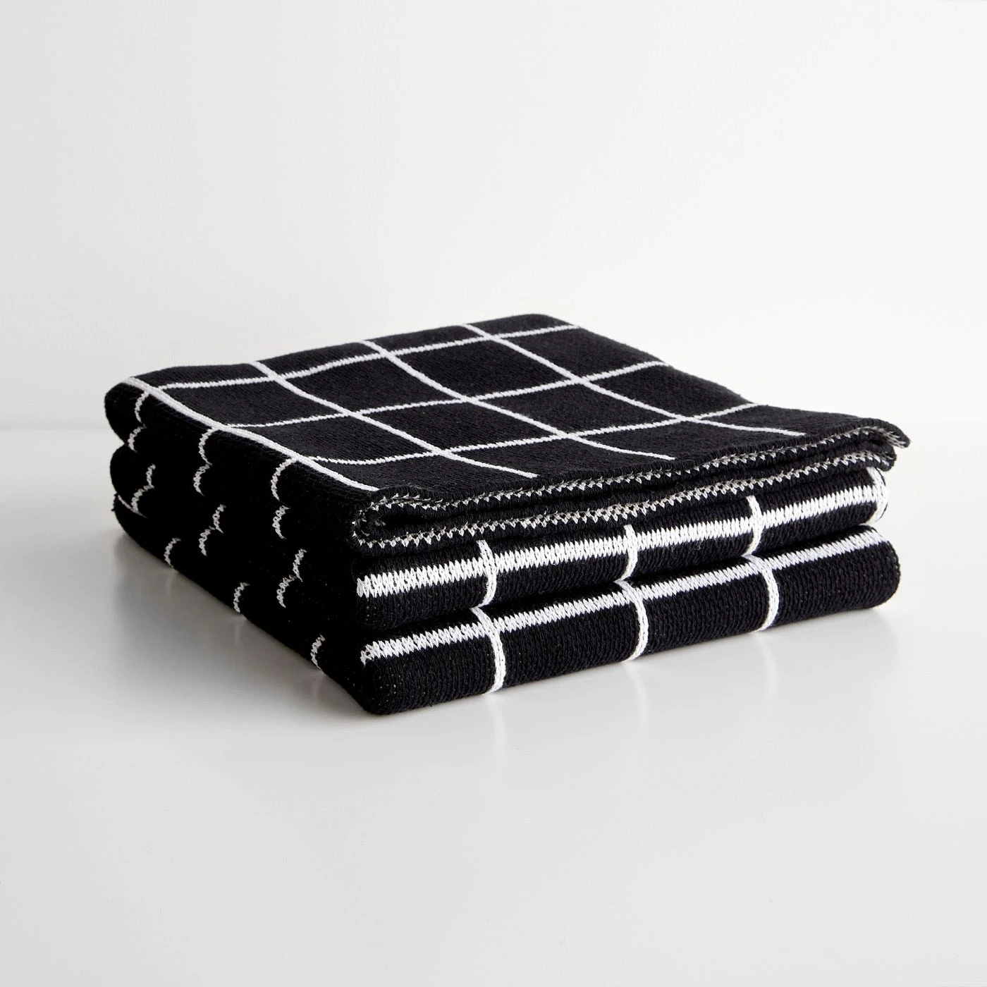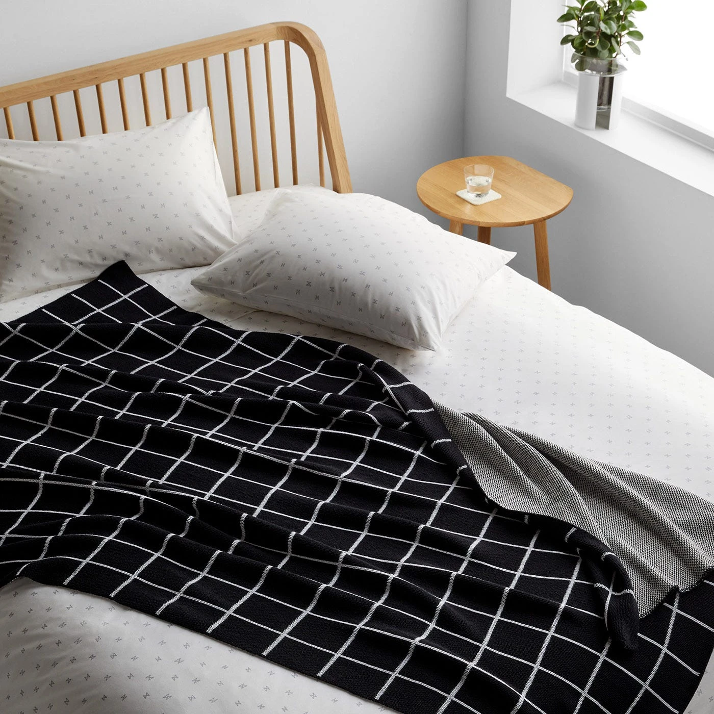 A strong and modern motif in black and white, this recycled cotton and polyester blanket makes a graphic statement in any interior. This double-knit throw has a sweater like texture that is both weighty and warm, adding a comfortable and attractive accent to the home. Featuring a signature Unison grid pattern, and produced by a fourth-generation family owned textile manufacturer, the Grid Black Knit Throw Blanket is both designed and produced in the USA.