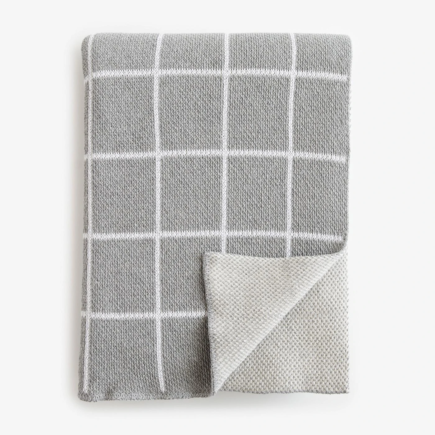 A modern motif in monochromatic tones, this recycled cotton and polyester gray blanket makes a warm addition to any interior. Drape it across the arm of a sofa, or lay it out at the foot of the bed, this graphic double-knit throw has a sweater like texture that is both weighty and warm. Featuring a signature Unison grid pattern, and produced by a fourth-generation family owned textile manufacturer, the Grid Gray Knit Throw Blanket is both designed and produced in the USA.