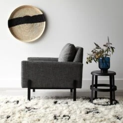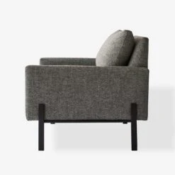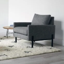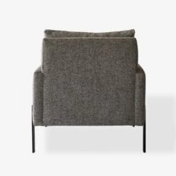 Quality you can touch. The Gunnison Chair is benchmade in North Carolina by a single craftsperson from start to finish. This minimal armchair features a twill-tweed fabric in heathered ash colorway that has a way of bringing calm to your space. The solid wood frame is constructed from kiln-dried maple wood that has been double-dowelled and glued, with blocked corners and joint breakers to form a solid base. It’s double padded with an extra layer of foam for durability and support. The inner no-sag springs are designed for long-lasting comfort. With sturdy black steel legs and a removable back cushion, this slim armchair is a stunning standalone piece. Comfort and great design combine in this modern accent chair.