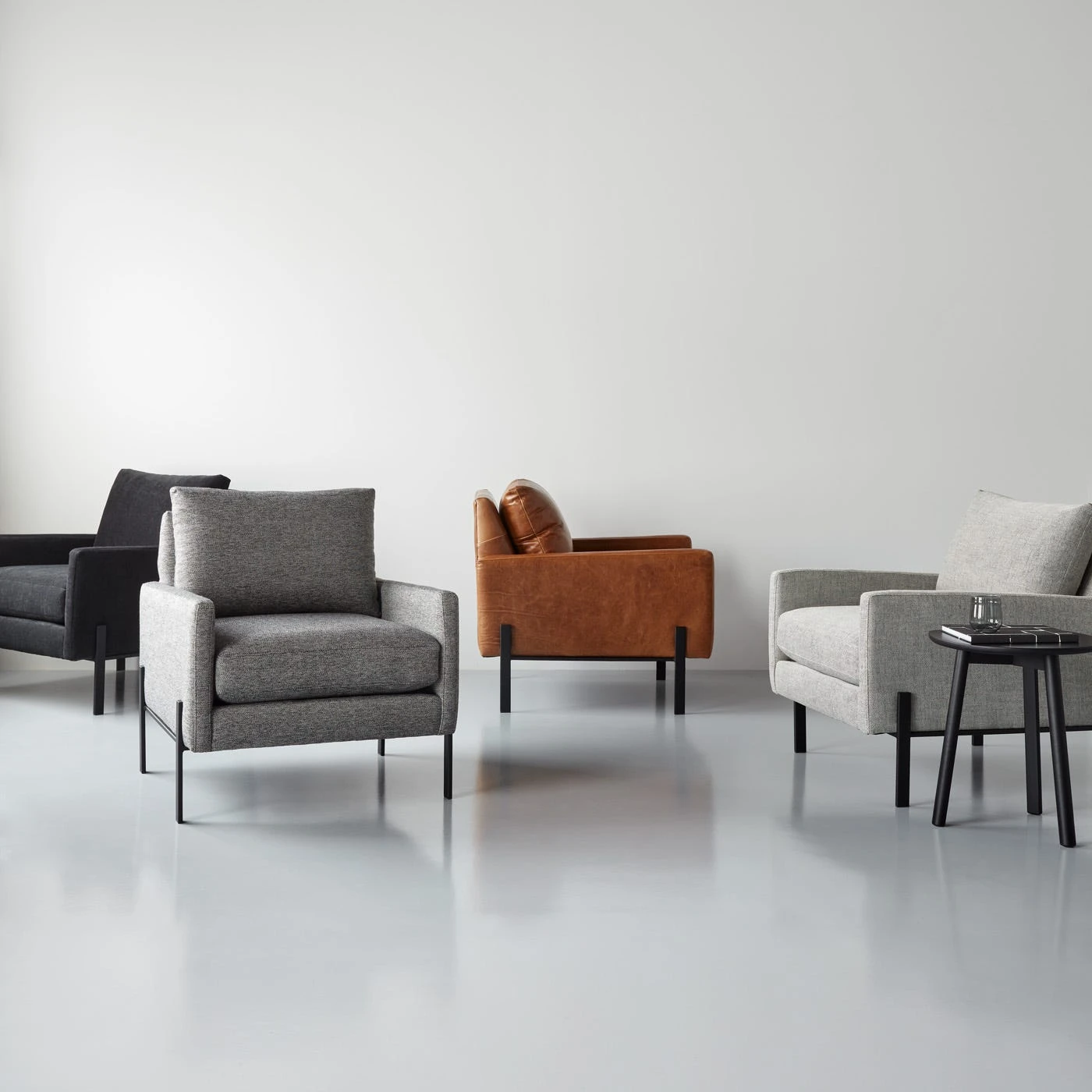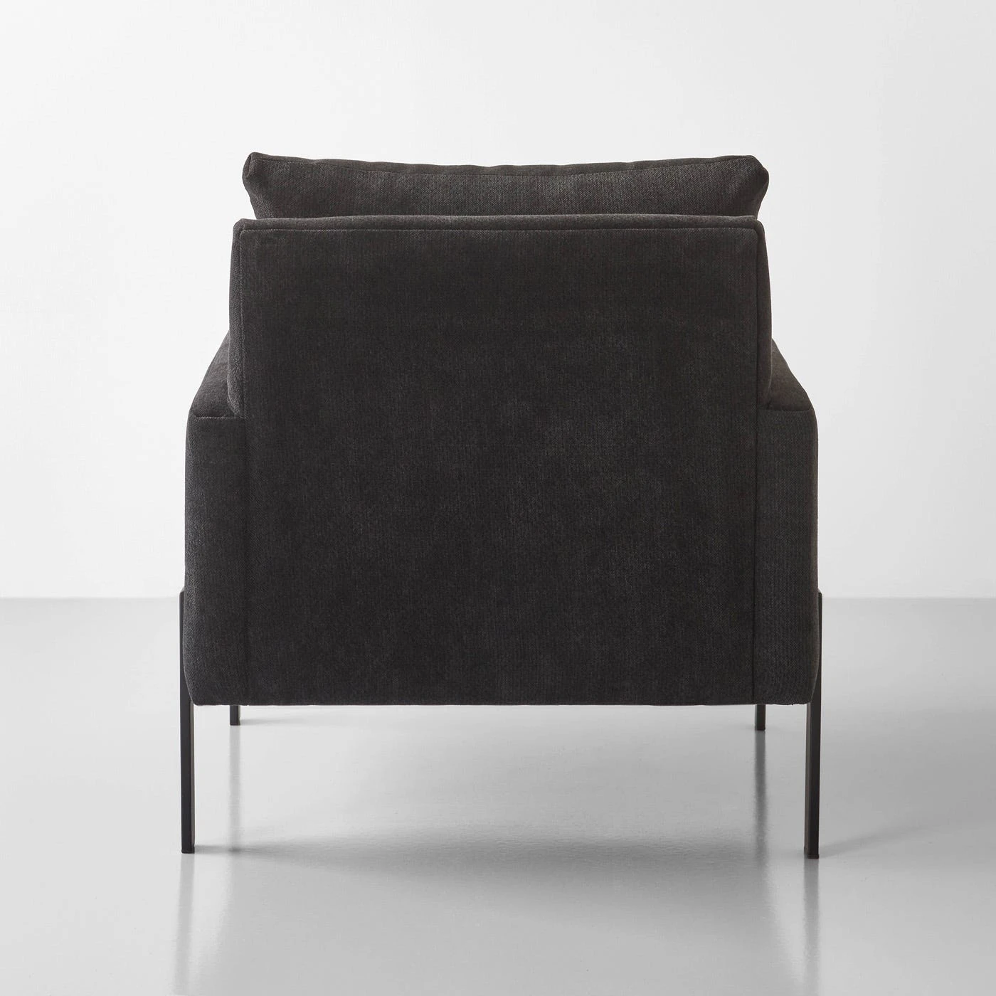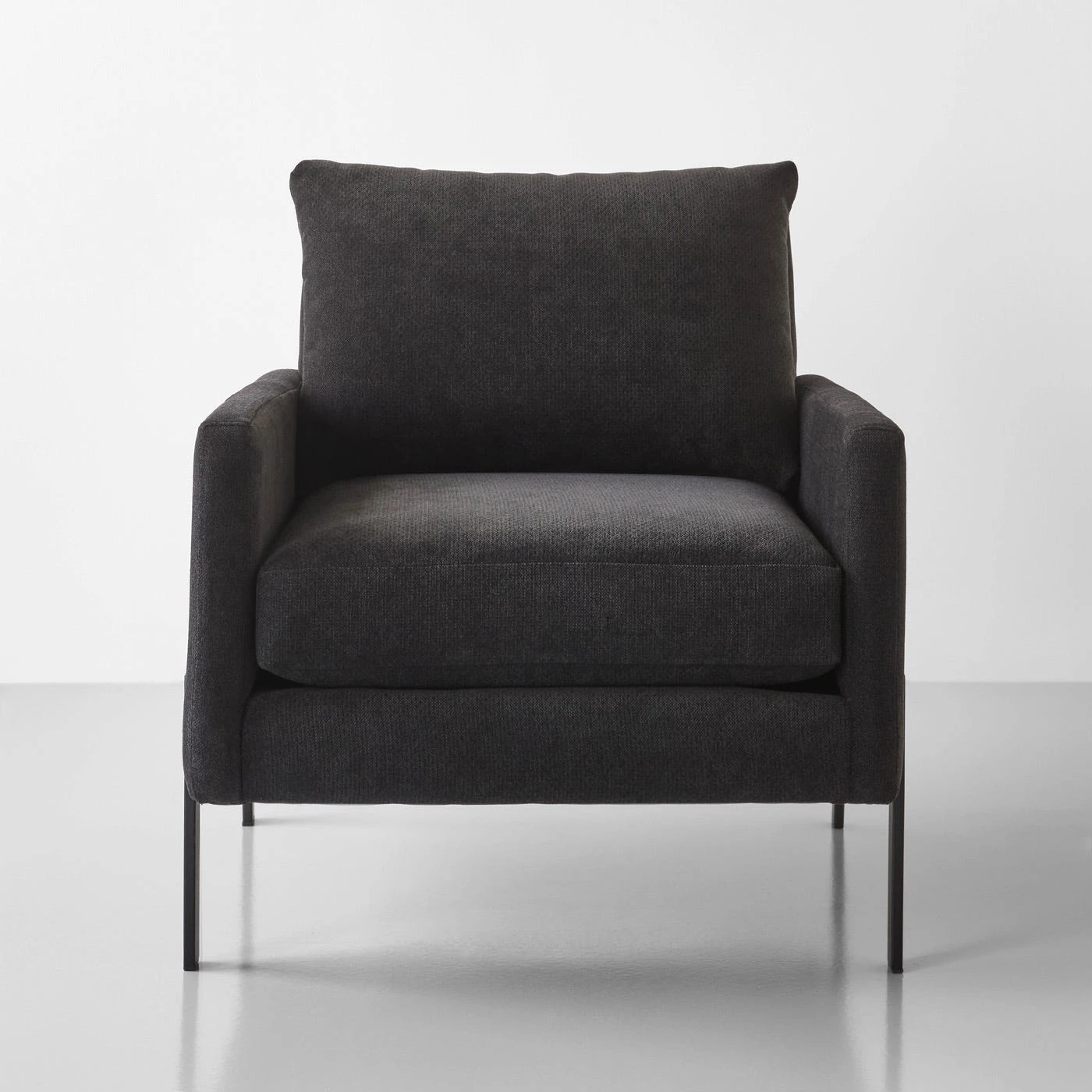Quality you can touch. The Gunnison Chair is benchmade in North Carolina by a single craftsperson from start to finish. This minimal armchair features a velvety black performance fabric that is stain and odor resistant to stand up to everyday wear. The solid wood frame is constructed from kiln-dried maple wood that has been double-dowelled and glued, with blocked corners and joint breakers to form a solid base. It’s double padded with an extra layer of foam for durability and support. The inner no-sag springs are designed for long-lasting comfort. With sturdy black steel legs and a removable back cushion, this slim armchair is a stunning standalone piece. Comfort and great design combine in this modern accent chair.