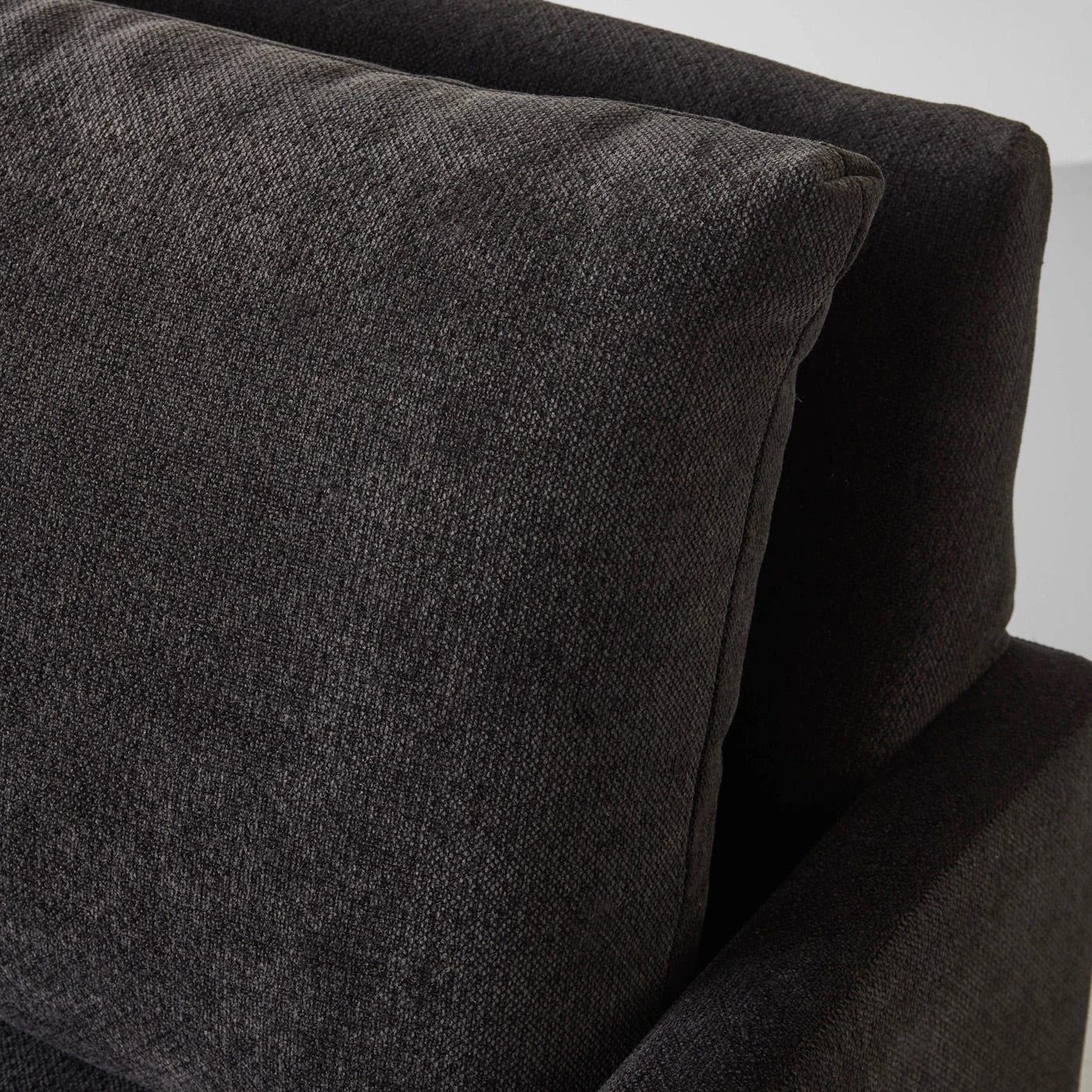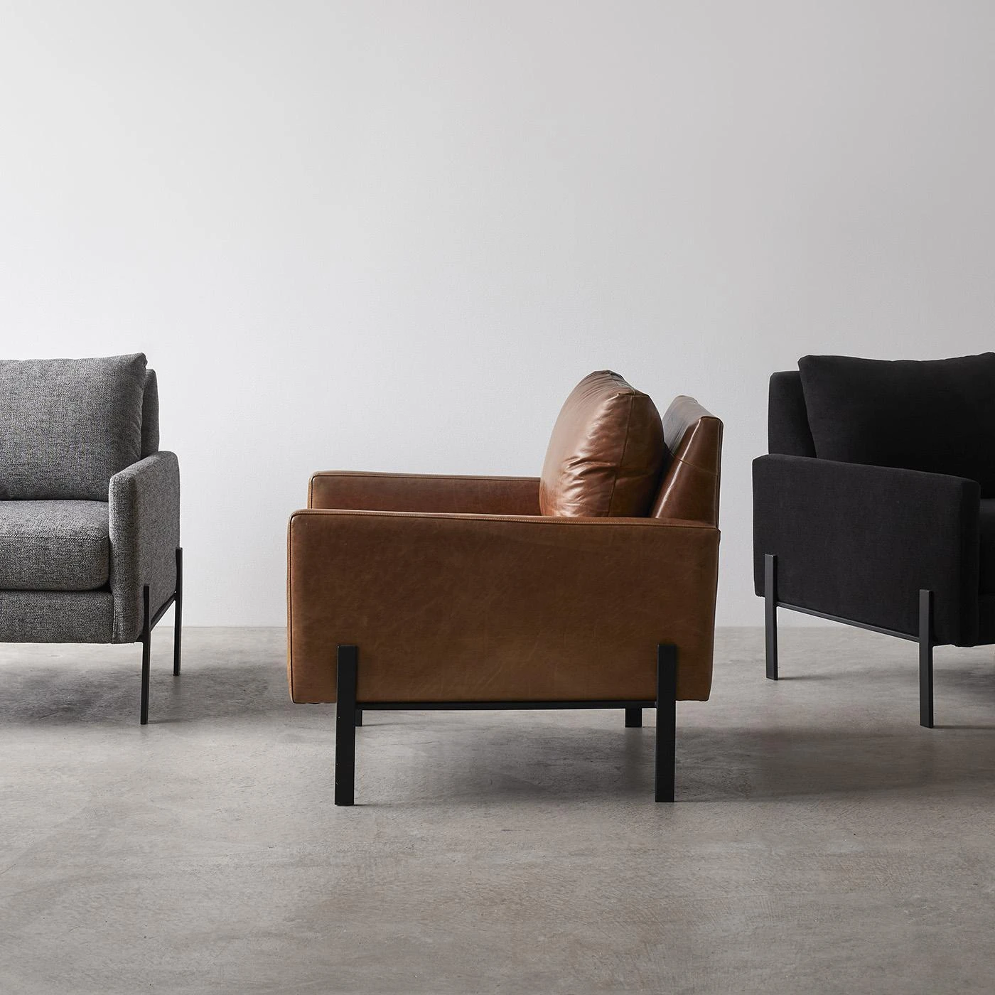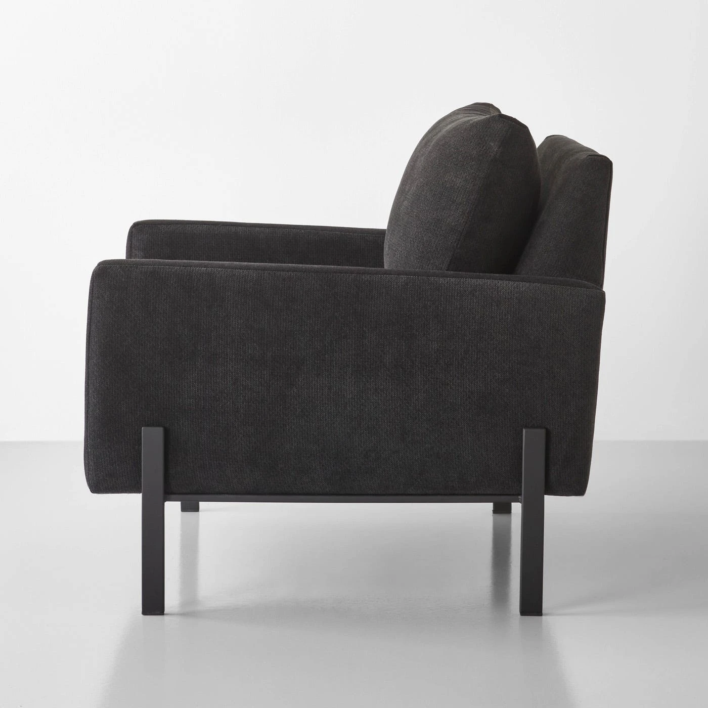 Quality you can touch. The Gunnison Chair is benchmade in North Carolina by a single craftsperson from start to finish. This minimal armchair features a velvety black performance fabric that is stain and odor resistant to stand up to everyday wear. The solid wood frame is constructed from kiln-dried maple wood that has been double-dowelled and glued, with blocked corners and joint breakers to form a solid base. It’s double padded with an extra layer of foam for durability and support. The inner no-sag springs are designed for long-lasting comfort. With sturdy black steel legs and a removable back cushion, this slim armchair is a stunning standalone piece. Comfort and great design combine in this modern accent chair.