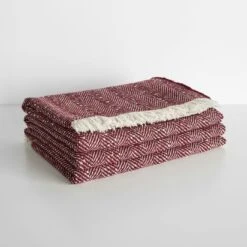 The Herringbone Bordeaux Poppy Throw Blanket has deep roots in textile history. Created by Mourne Textiles founder Gerd Hay-Edie in the 1960s for use in clothing design, this signature herringbone pattern translates seamlessly as a modern interior fabric today. High-quality yarns in varying thicknesses give each throw a distinctive texture and a soft, snug feel. The woody autumnal tones of the Mourne Mountains have inspired this rich crimson color, which contrasts with the lighter yarns that extend into a natural fringe at the edges.