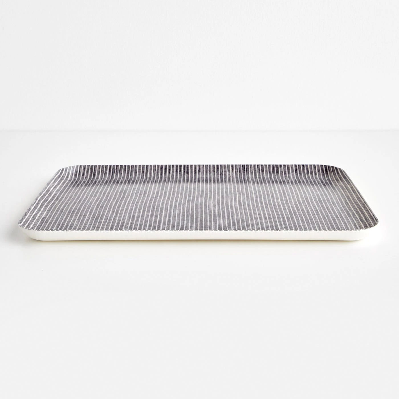The Hickory Gray Stripe Linen Coated Tray is made in Japan by coating linen fabric with polyester resin. The dark bluish gray and thin white striped pattern serves as a lovely accent for decorating and entertaining alike. Lightweight yet sturdy, this striped tray features softly rounded corners and a slight lip to keep items in place. The large tray size is perfect for serving drinks to guests or transporting snacks to the family room. The smooth surface can also function as a place to collect keys, wallets, mail and other odds and ends near an entryway.