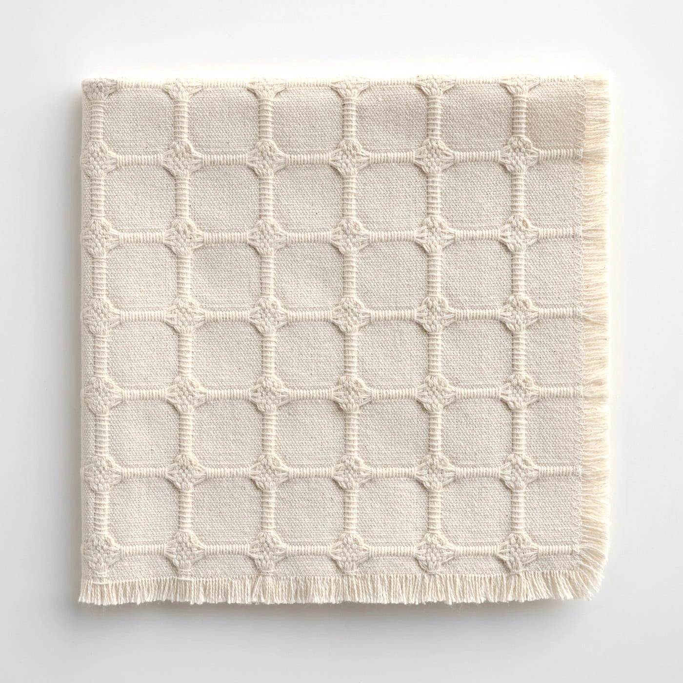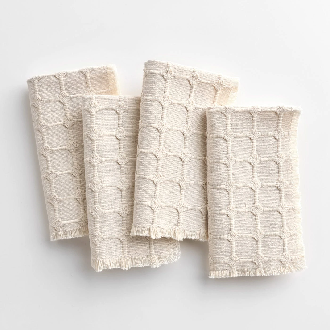 Hopsack Cloud Napkins bring understated beauty to everyday meals. Sold as a set of four, these natural white napkins feature natural cotton yarns woven to create a basket-like pattern. Traditional hand-knotting techniques are applied by Mexican artisans using ivory threads to achieve this effect. The woven yarns and short frayed edges add depth and texture, and the napkin’s fabric will continue to soften and relax over time. These all-natural white cotton napkins complement almost any dinnerware design.