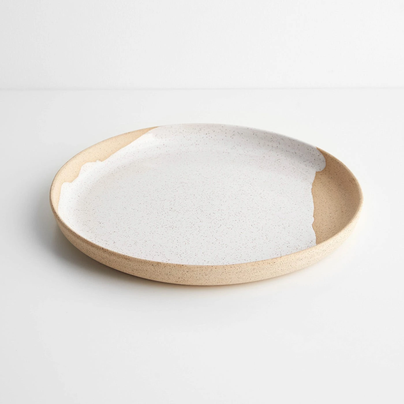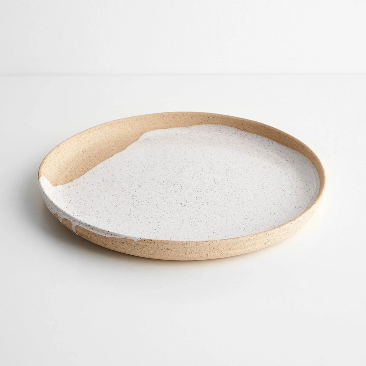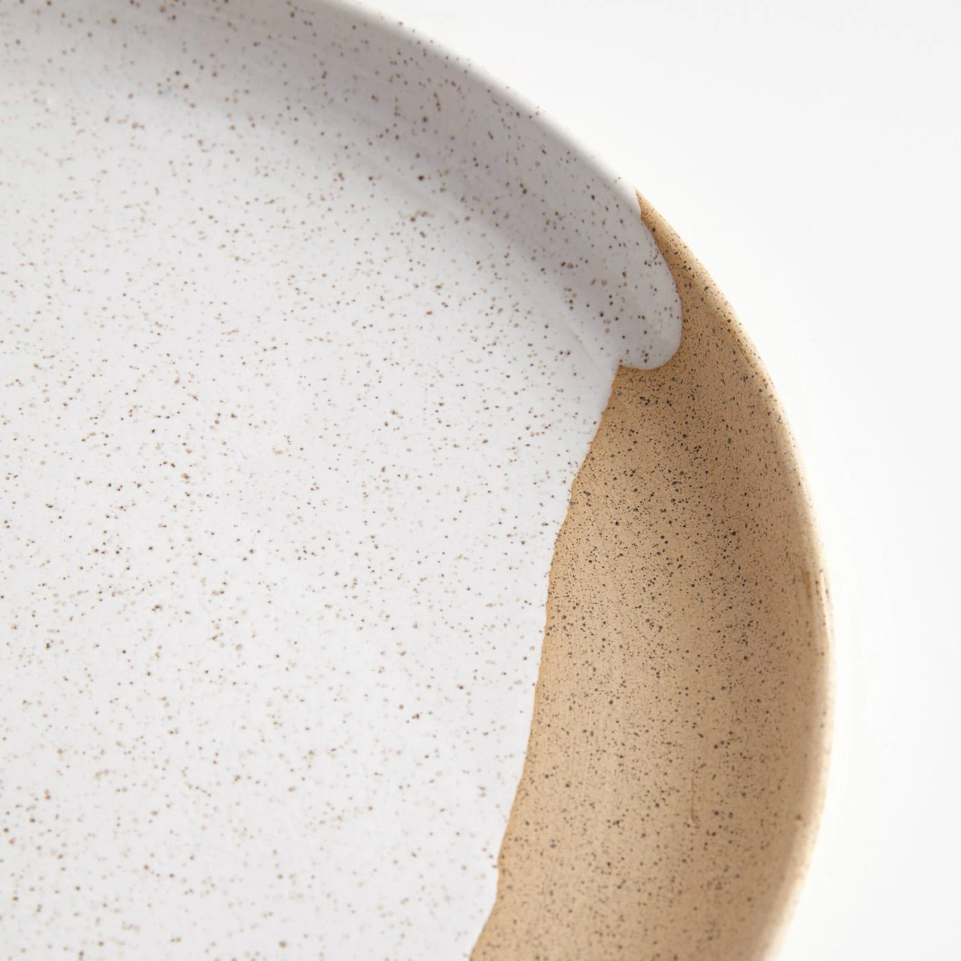 The Ilog Platter brings nature-inspired beauty to the dinner table. Ilog (pronounced ee-lohg) means “river” in Tagalog, a name derived from the way the white satin glaze flows over the piece to create organic pooling and drips down the sides. Crafted exclusively for Unison in this colorway by Debbie Carlos, the speckled tan ceramic stoneware features a raw texture, creating a subtle contrast with the smooth glaze. With each piece created by hand, no two are exactly alike. When not used for serving dishes, this unique piece can function as a beautiful tray for showcasing decorative items.