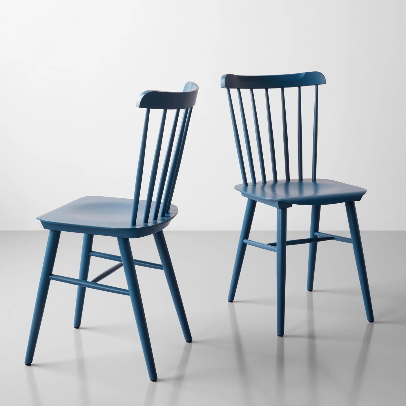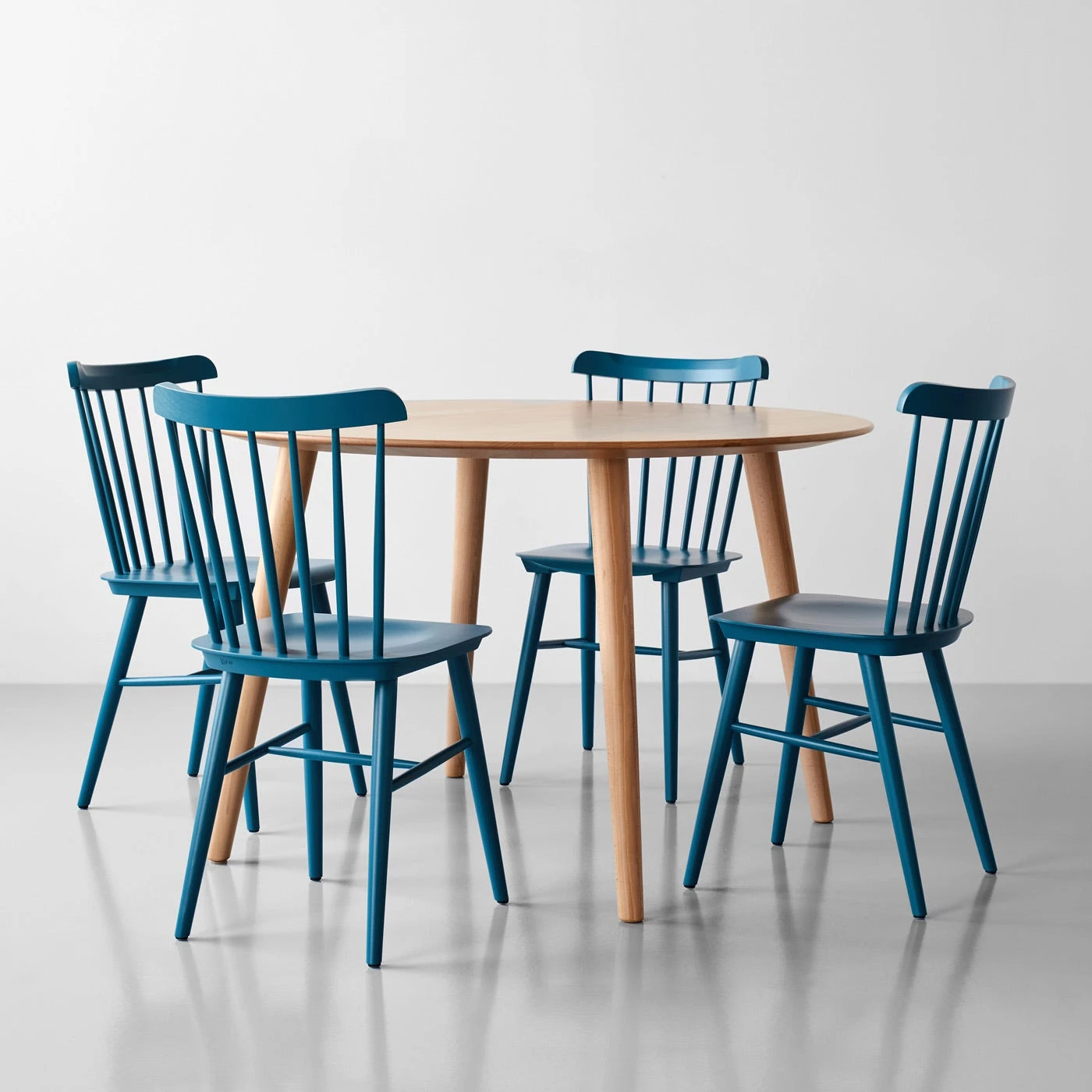 The Ironica Mountain Fjord Chair offers unequivocal timelessness and craftsmanship. Made by TON, a maker of bentwood furniture since 1861, each chair is created by skilled artisans in the Czech Republic. Natural beech wood has been shaped into the iconic Shaker-style back, complete with seven hand-smoothed spindles and a curved backrest. The gentle slope along the front edge and a shallow indentation ensure superior seated comfort. The richly saturated deep teal finish of this Windsor-inspired chair adds a vibrant accent to any dining table.