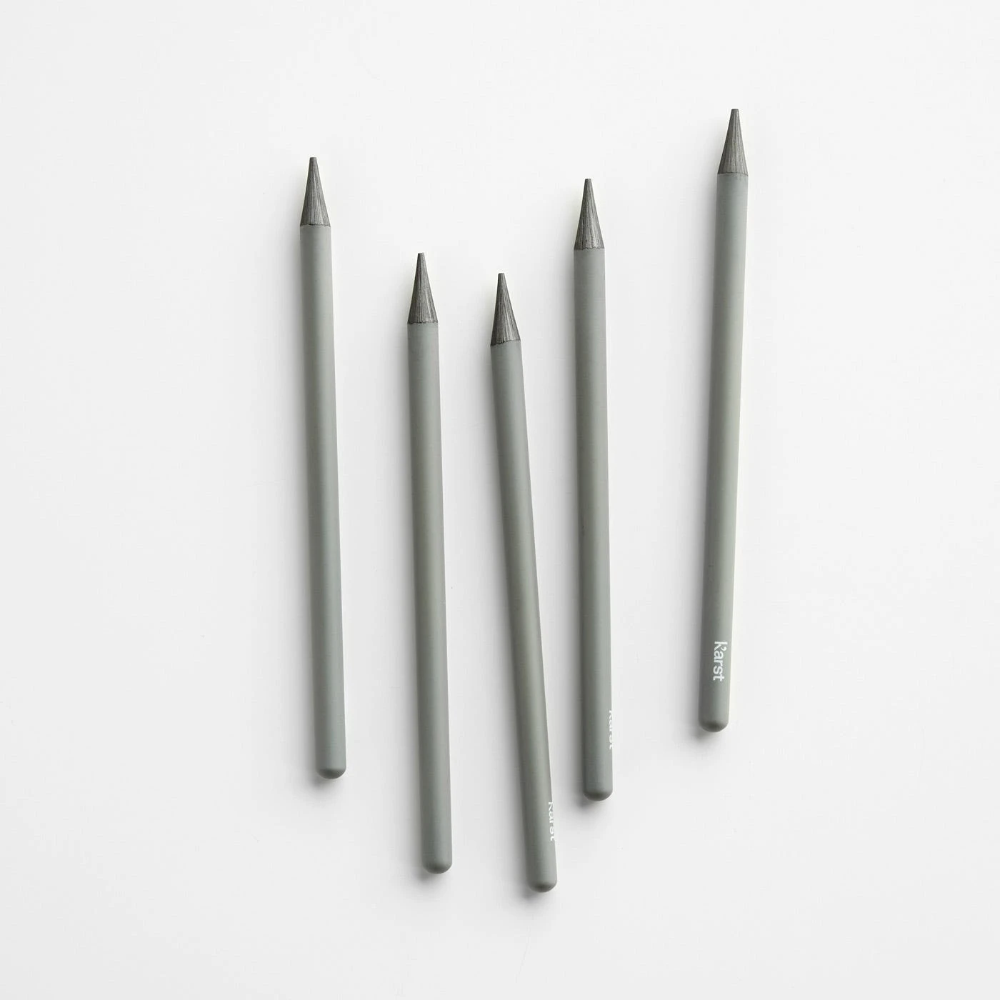 This set of five Karst Woodless Graphite Pencils offers a tree-free alternative to traditional writing utensils. Each one is crafted from 100% pure, solid graphite with 2B hardness. Without the unnecessary wood barrel, these pencils offer five times more pigment. A smooth matte coating helps to keep fingers clean and minimize smudges. These dark gray pencils work with any regular sharpener and deliver friction-free writing on the ultra-smooth stone pages found in Karst notebooks and journals. Beautifully packaged in a slim box, they arrive ready for gifting to students, writers, artists and other creatives.