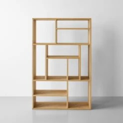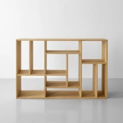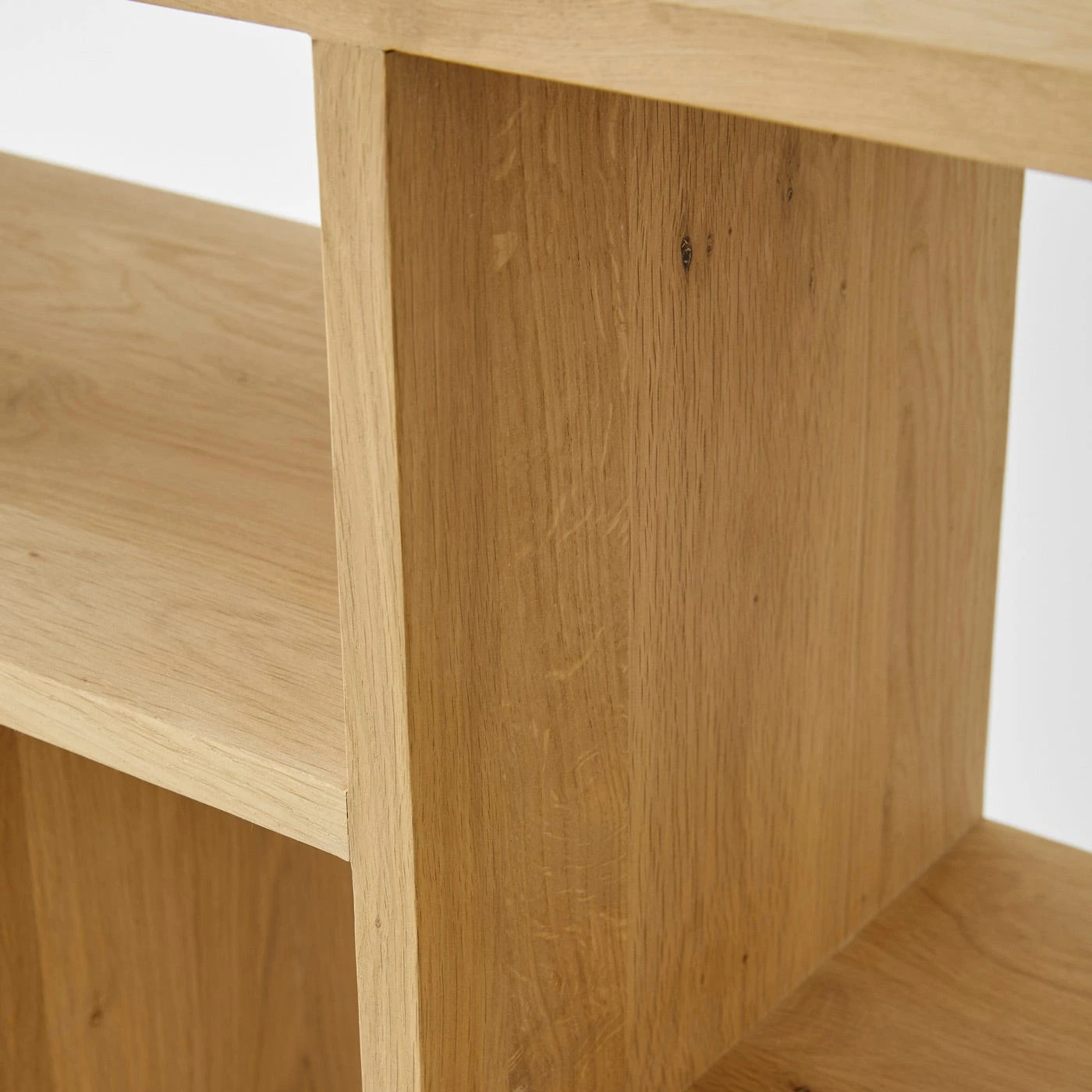 Add dimension and a warm organic feel to your living space. This modern shelving unit is grid lined, inspired by the famous Dutch painter Piet Mondrian. This unique shelving unit consists of rectangular and square compartments of different sizes, perfect for displaying your favorite pieces. Natural white oak frames multiple openings creating functional and attractive shelves. Store and display anything from books to art objects with this oak shelving unit.