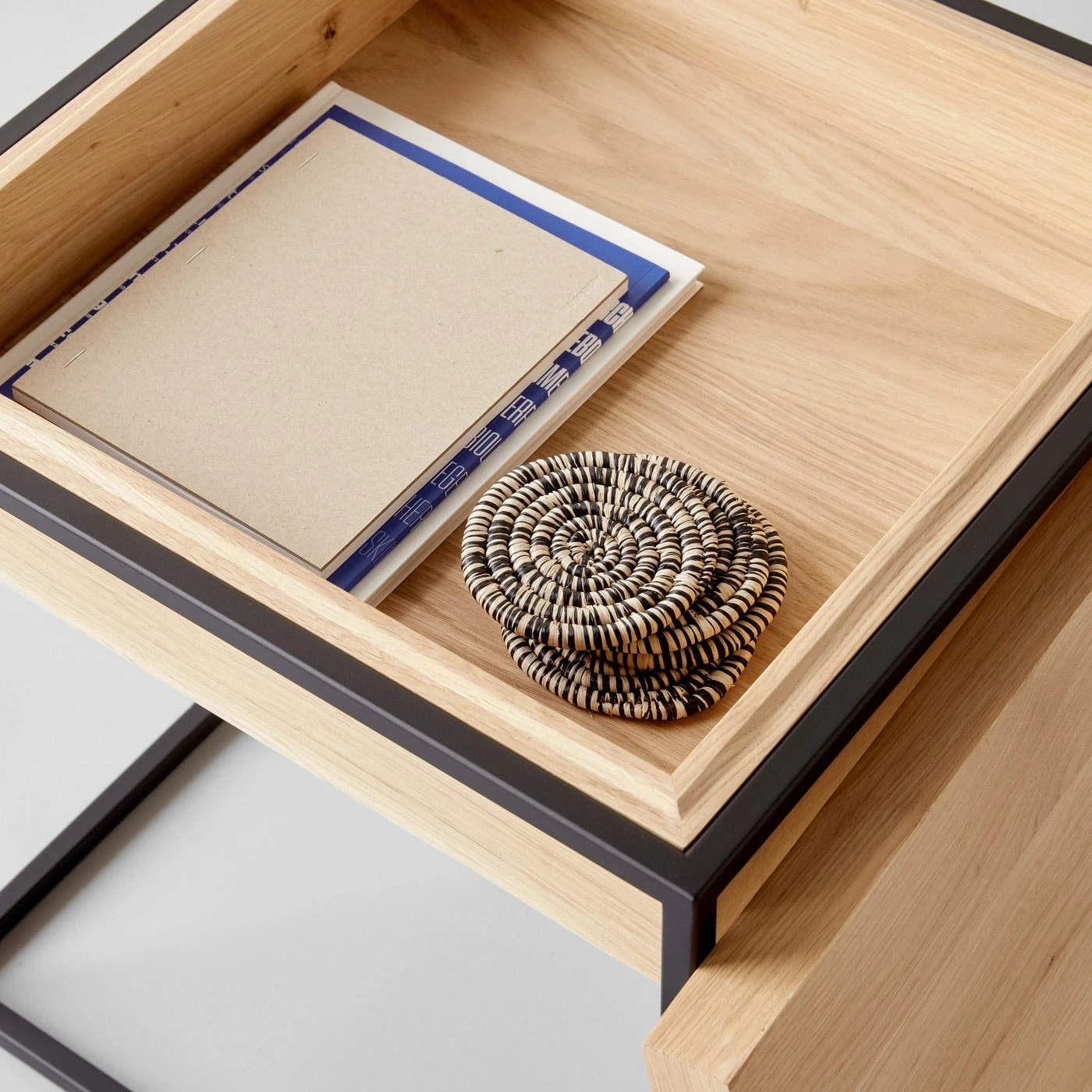 Form and function squared. The perfect side table for the practical minimalist, its strong lines make it a subtle statement piece, and the top lifts off for a discreet storage option. Store tabletop accessories from remote controls to coasters inside for a clean and sleek surface on top.