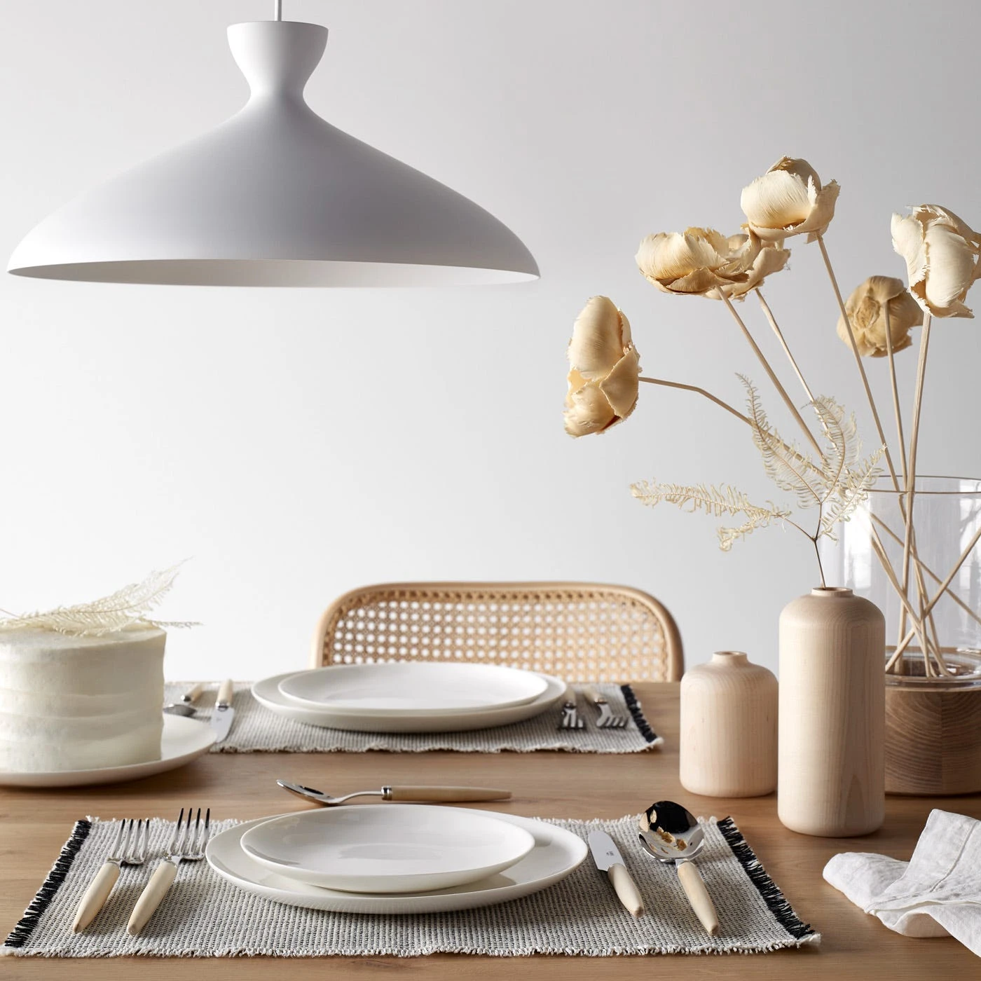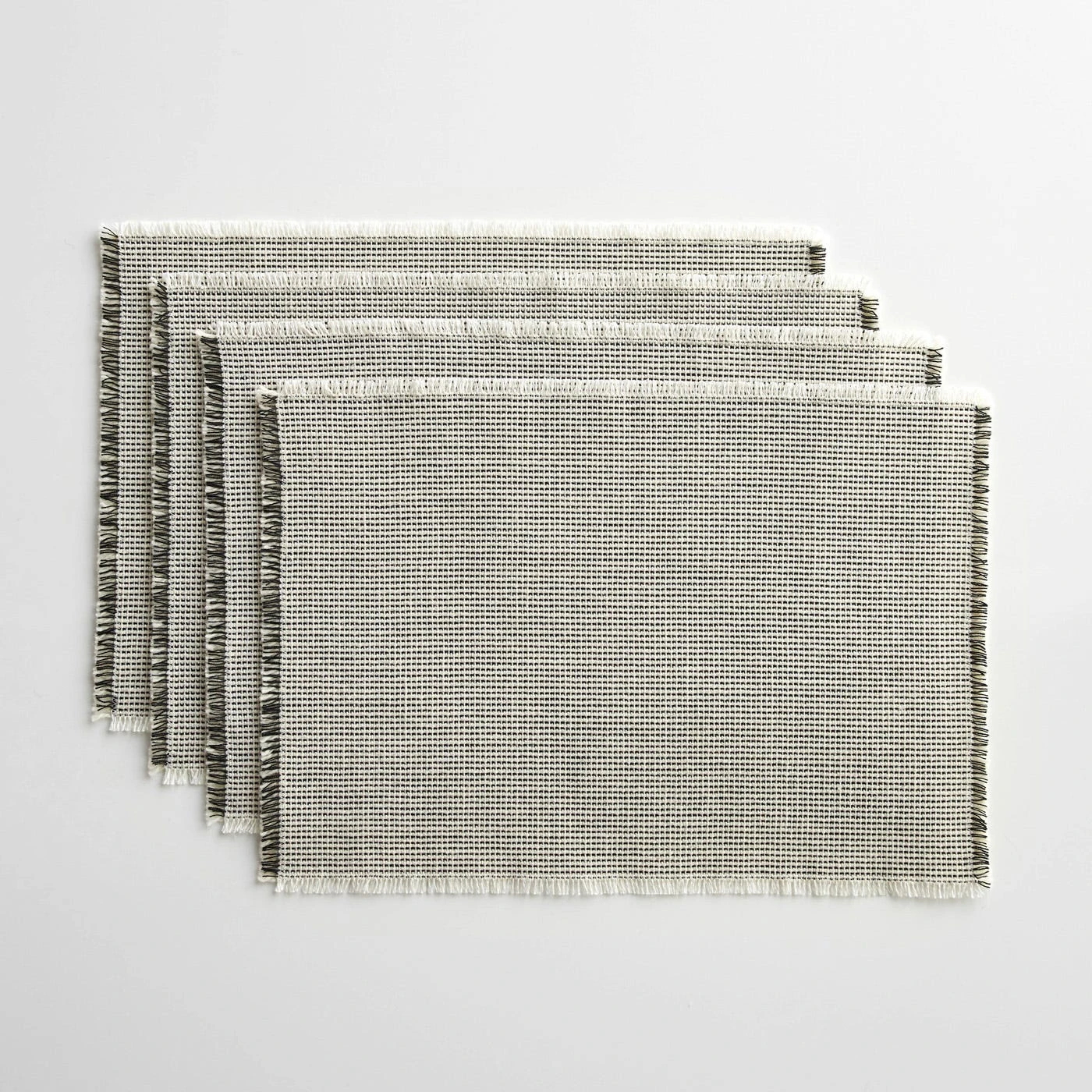 Originally introduced in 1951 and designed by Norwegian textile designer Gerd Hay-Edie, this set of four placemats shares a story about timeless design and craft. Hay-Edie has made a lasting impact throughout a career that spanned much of the 20th century. Her legacy on the world of woven textiles is now being carried on by her family through Mourne Textiles, who continue to produce her original designs. Mourne Textiles still use traditional hand-loom techniques in the foothills of the Mourne Mountains in Northern Ireland. The pattern of these placemats is as appreciated today as it was decades ago. These placemats are mostly ivory in color, with dashes of black for a soothing pattern with short fringed edges.