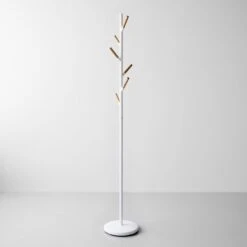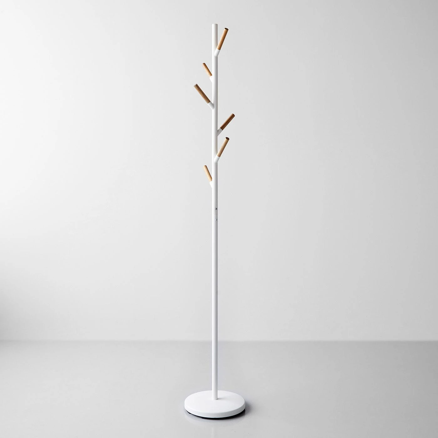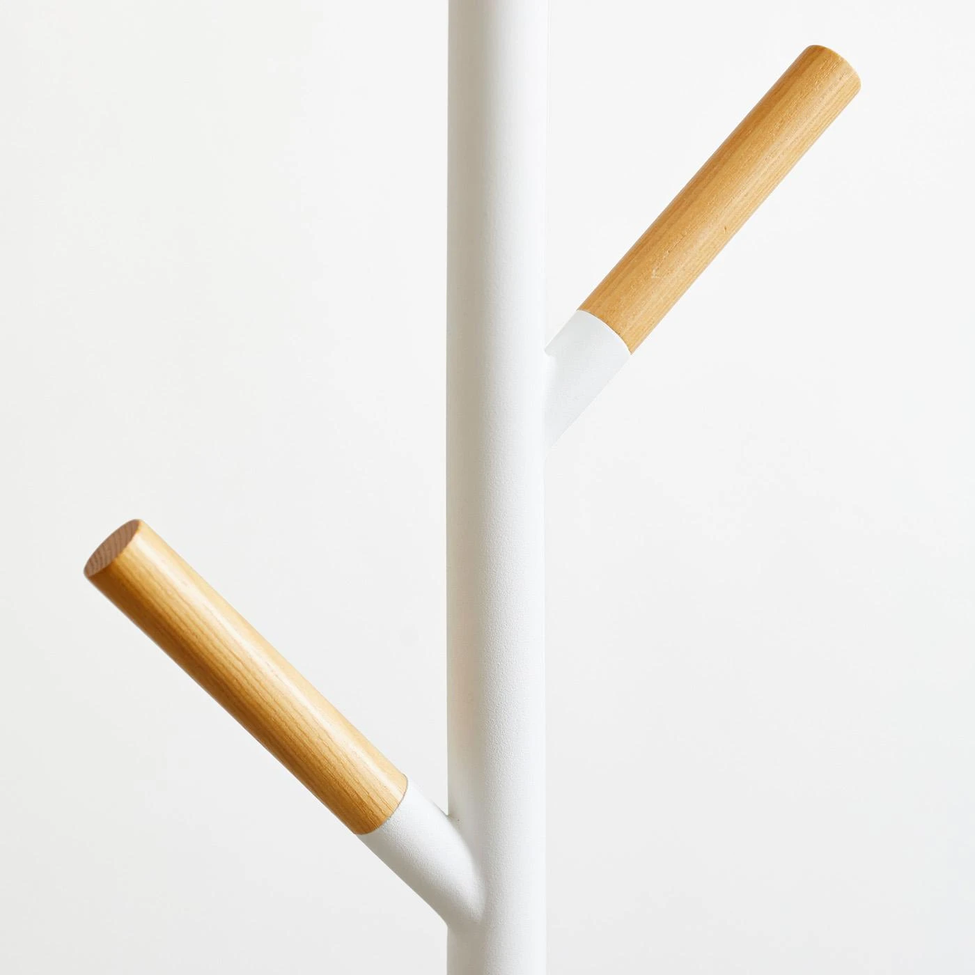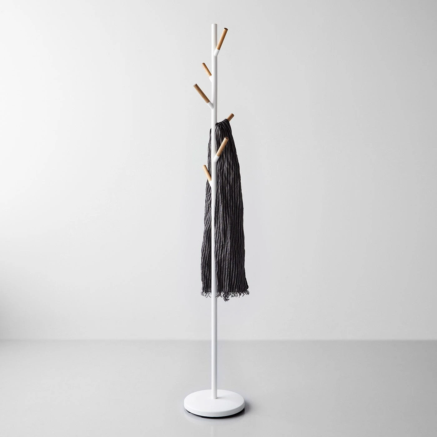 Designed in Japan, the Nara White Coat Tree is slender enough to fit into small spaces, yet sturdy enough to maximize storage. The minimal design has six wooden pegs that are staggered to represent tree branches and provide optimal space to hang coats, bags, hats and scarves. This power-coated steel coat rack is durable, with a weighted base designed to keep it upright and planted firmly in place. Perfect for entryways, offices and bedrooms, this coat tree has a simple silhouette, small footprint and solid design that make it a quality addition to any space.