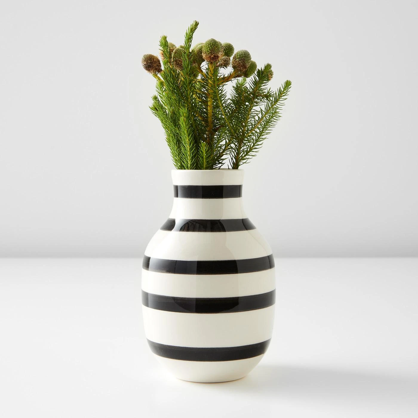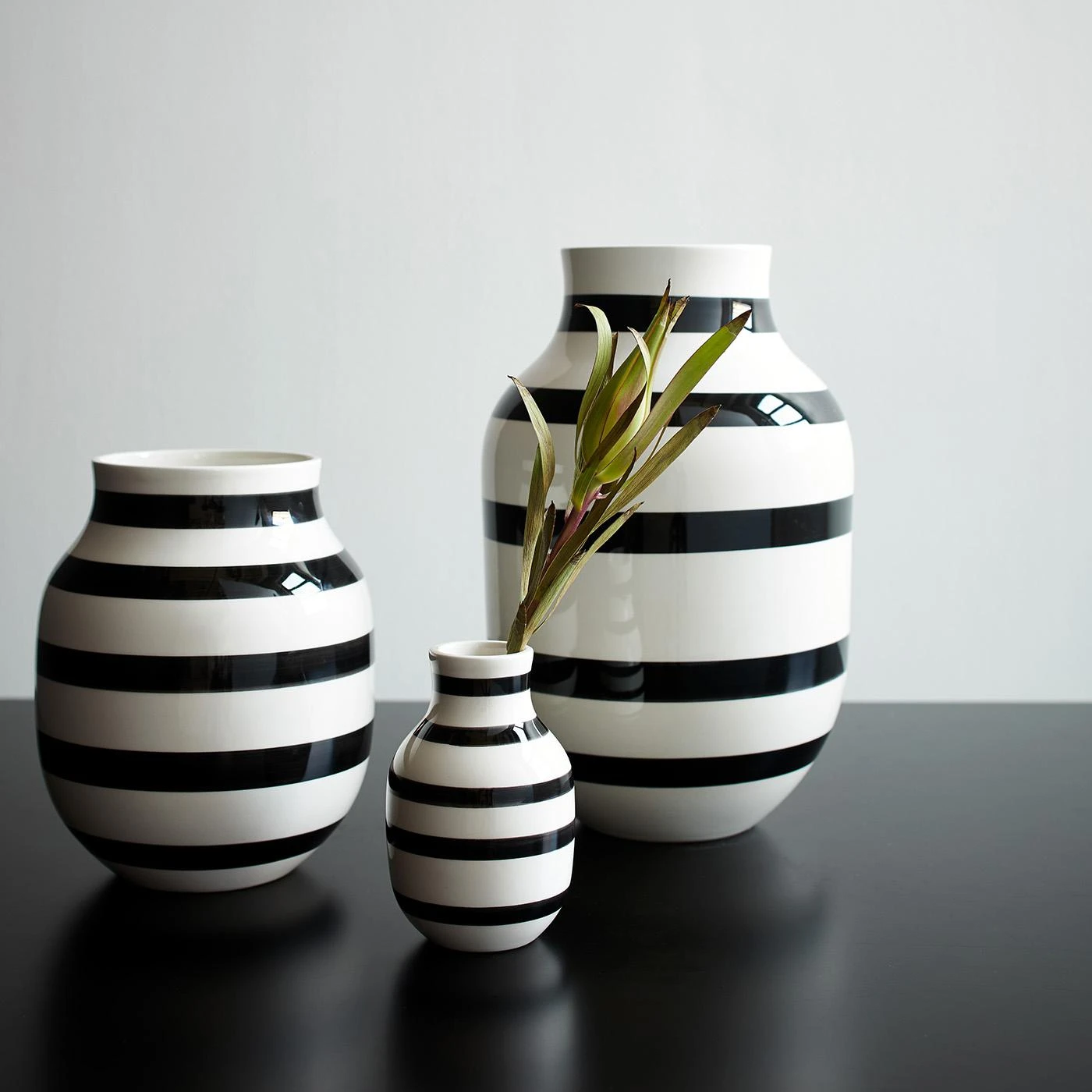 Add a mod twist to your home with this uniquely striped vase. Conceptualized by design duo Ditte Reckweg and Jelena Schou Nordentoft, the Omaggio Collection presents a perfect combination of sharp and soft, modern and timeless elements. The black hand-painted stripes on this classically shaped vase are subtle enough to let cuttings and small floral arrangements be the focus, yet special enough to make a statement. The Omaggio Black Small Vase can be styled on its own, or alongside other size combinations available in the collection.