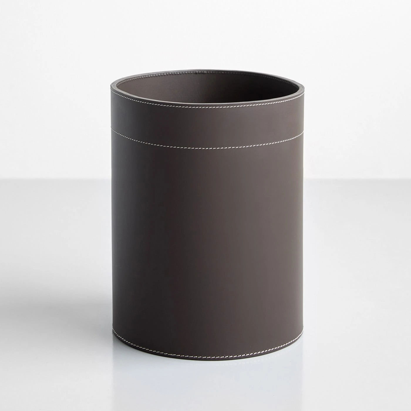 The Orskov Classic Chocolate Leather Waste Bin is the perfect example of the enduring functionality of good design. The bin was first introduced in the 1960s by Torben Orskov, the founder of Orskov Copenhagen, and has been produced ever since. The dark brown leather waste basket is now made of recycled, vegetable-tanned leather accented by visible white stitching. The smooth leather is thick and sturdy, allowing the round bin to maintain a structured shape. This piece of design history features a rich, deep mahogany color which looks sophisticated enough to display in a home office or bedroom.