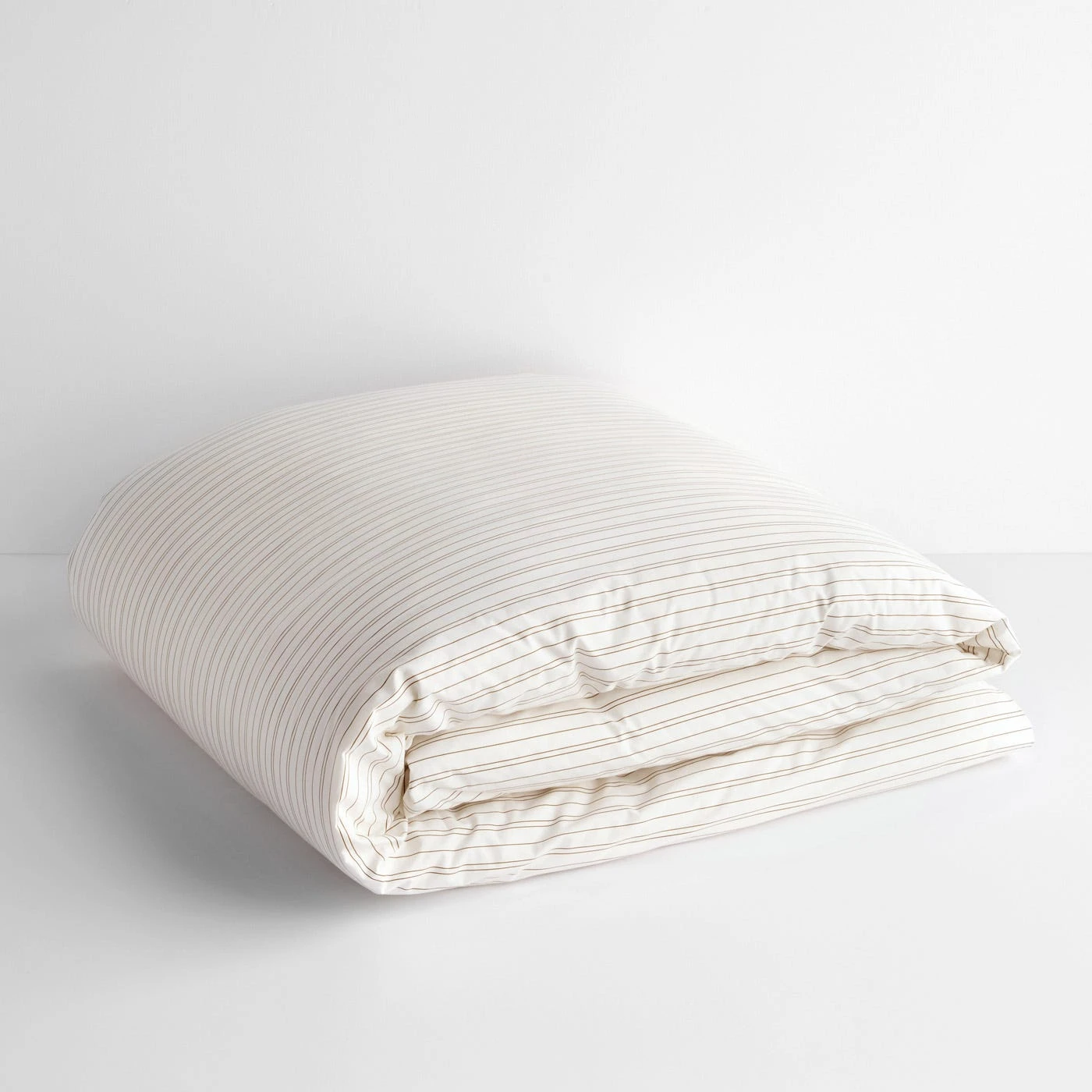 Reintroducing the Porter collection. Originally featured in a range of colorful bedding and dining textiles in 2008, this simple striped print feels tailored without being formal. The dapper lines in a rustic orange hue are paired with a classic ivory base, and the vertical orientation of this duvet cover creates a subtle contrast with the horizontal lines on the matching pillowcases. Printed on Oeko-Tex® certified 100% cotton percale with a 220-thread count, it boasts a smooth, crisp feel that’s breathable year-round. Made in Portugal, this duvet cover features hidden value closures and four corner ties that keep your duvet in place. Like a freshly starched value-down shirt, Porter bedding is versatile and perfectly understated.