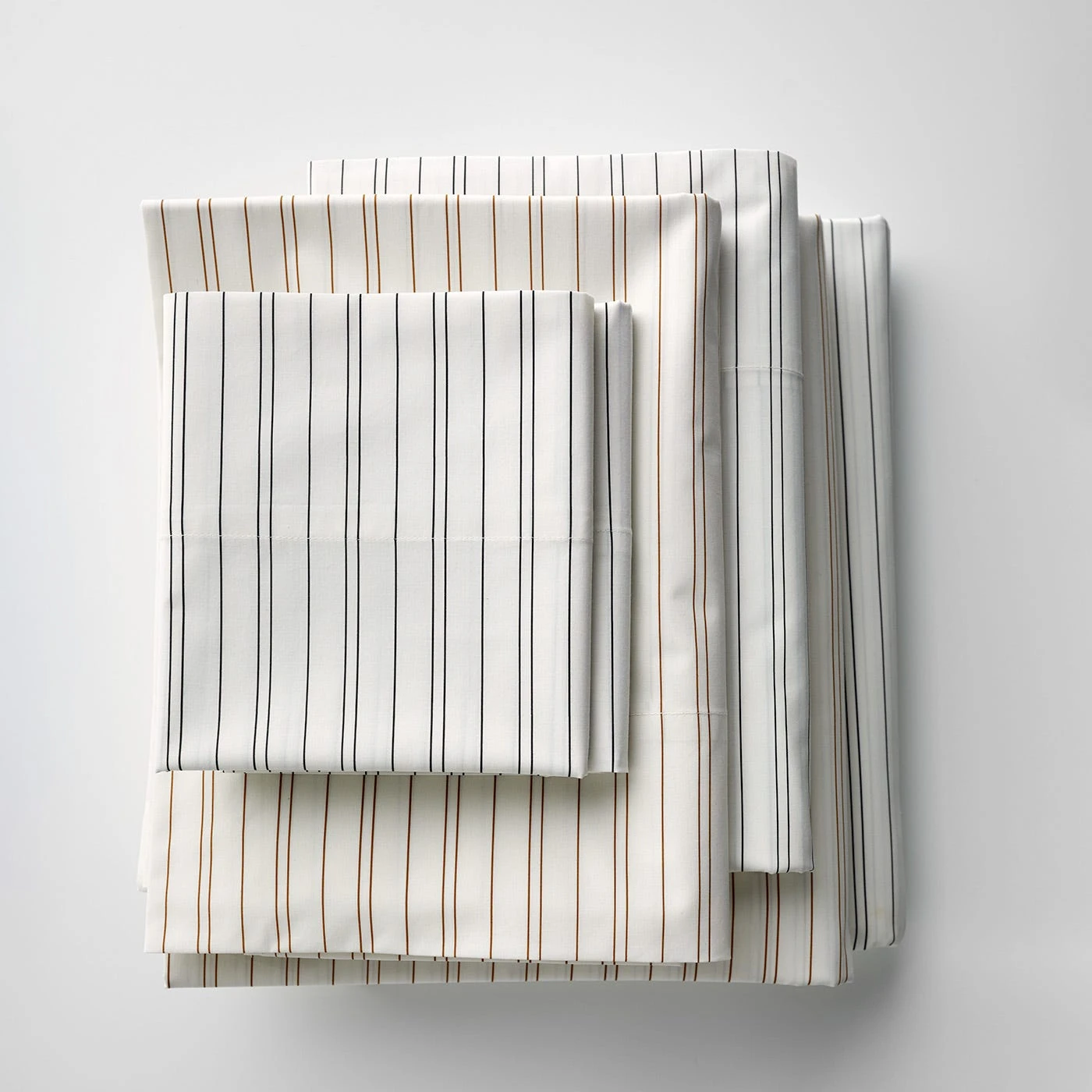 Reintroducing the Porter collection. Originally featured in a range of colorful bedding and dining textiles in 2008, this simple striped print feels tailored without being formal. The dapper lines in a rustic orange hue are paired with a classic ivory base, and the vertical orientation of these sheets creates a subtle contrast with the horizontal lines on the matching pillowcases. Printed on Oeko-Tex® certified 100% cotton percale with a 220-thread count, it boasts a smooth, crisp feel that’s breathable year-round. Made in Portugal, this sheet set includes one flat sheet and one fitted sheet that features deep pockets and continuous elastic to help keep it in place. Like a freshly starched value-down shirt, Porter bedding is versatile and perfectly understated.
