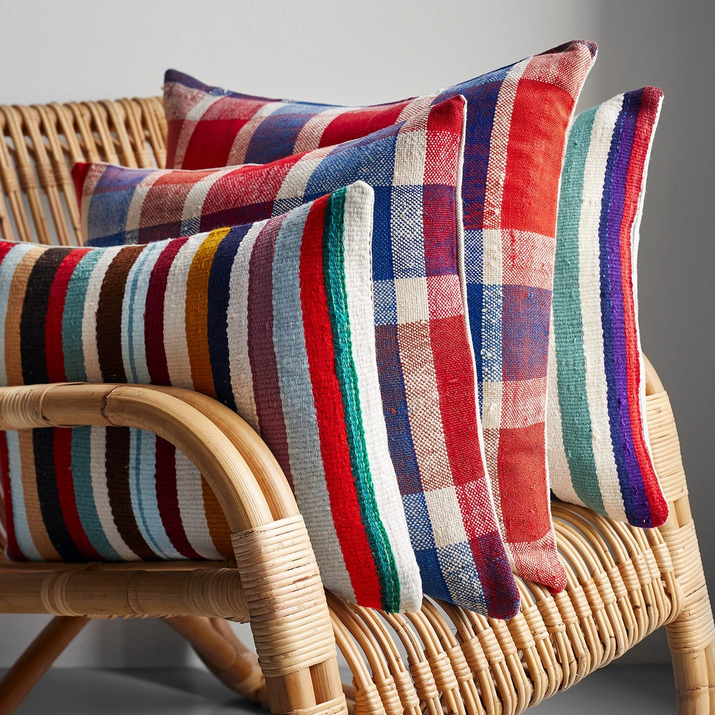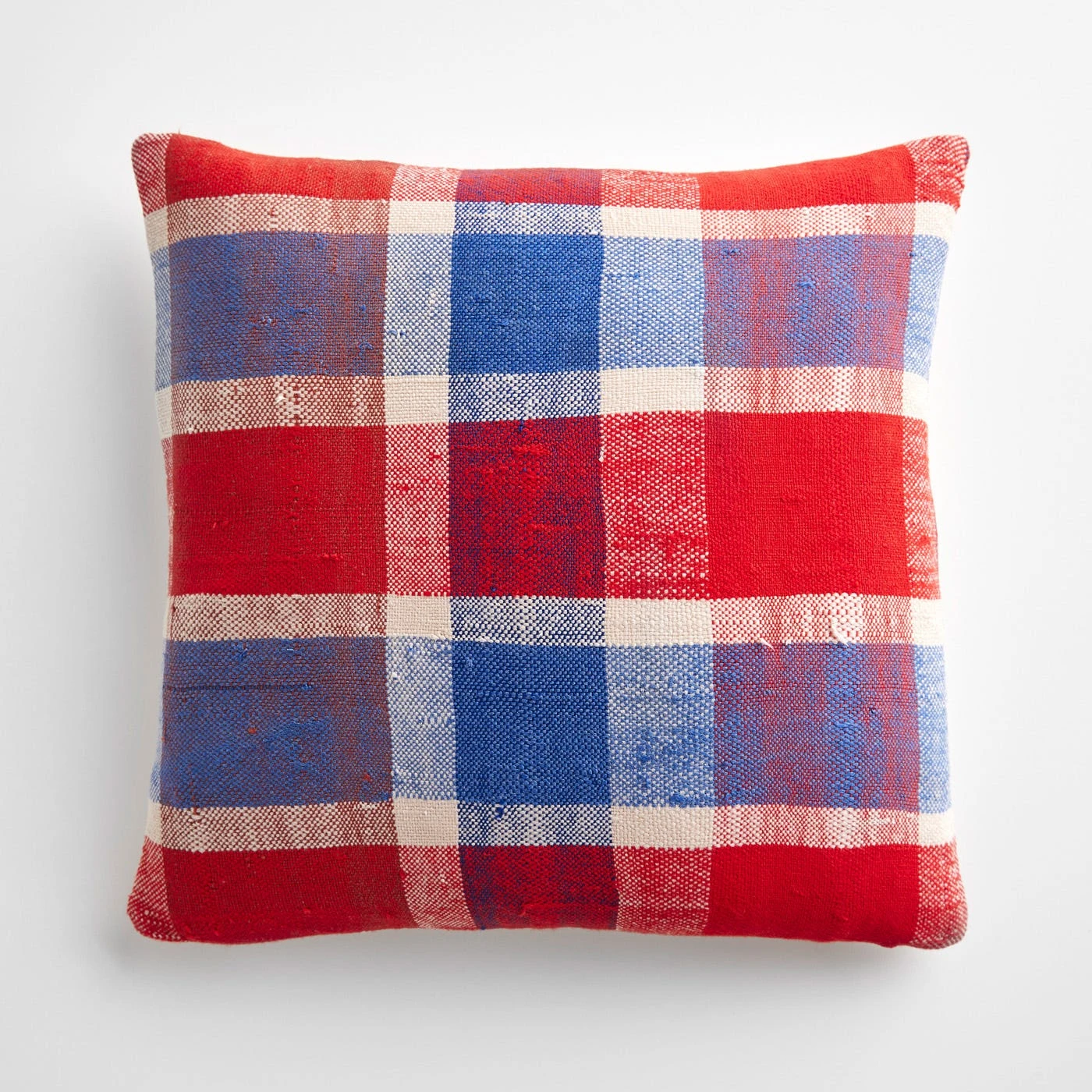 The 17″ x 17″ Rebia Plaid Throw Pillow Cover instantly infuses homes with a splash of bold color with its vibrant blue and red plaid pattern. These covers are made from vintage Moroccan fabrics created with weaving techniques passed down through generations. The beautifully handcrafted fabrics are sourced from the Middle Atlas mountain range region of Morocco, then carefully cut to create individual, one-of-a-kind pillow covers. The back features a heavier linen and cotton blend fabric in a neutral beige color. Simply slip your pillow of choice inside and close with the concealed zipper.
