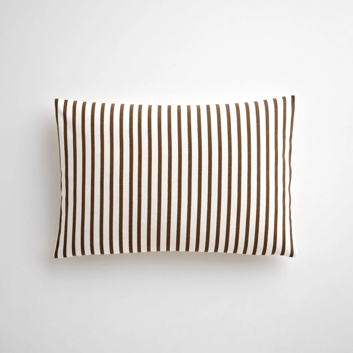 A refined, tailored home accent that takes inspiration from nautical stripes, the Sailor Bark Throw Pillow Cover has an effortlessly timeless quality. The simple, classic design features a rich, medium brown color, creating a crisp contrast against the bright white cotton sailcloth. The striped pillow cover fabric is hand screen-printed in the U.S. at a family-owned textile mill which has been operating since 1937, then cut and sewn locally in Chicago. This rectangular pillow cover with vertical stripes can be added to a sofa, chair or bed to serve as a decorative accent.