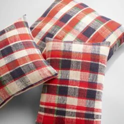 Kick back and relax with this reworked vintage throw pillow cover. Bold reds, navy blues and subtle blacks alternate within this unique plaid set on a tan background. Crafted from one-of-a-kind Moroccan textiles with a linen and cotton blended fabric back, this throw pillow cover makes a colorful statement. A spark of understated spring green adds just the right amount of brightness to break up this remarkable plaid pattern. Changing the pillow insert is a breeze thanks to the hidden zipper along the bottom of the pillow cover. Style your sectional with character, this plaid throw pillow cover is the finishing touch for your seating area.
