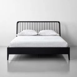 Bring sturdy, timeless craftsmanship into your home with the Spindle Black Bed. Modeled after the classic spinning wheel, the headboard is accented by vertical spokes and rounded upper corners that curve around the bedside for a snug, tucked-in feel. The richly stained wood is lacquered for protection then brushed to reveal the depth and texture of the natural wood grain. With its solid white oak frame supported by durable beech slats, this bed offers the unending support you need for a restful night’s sleep.