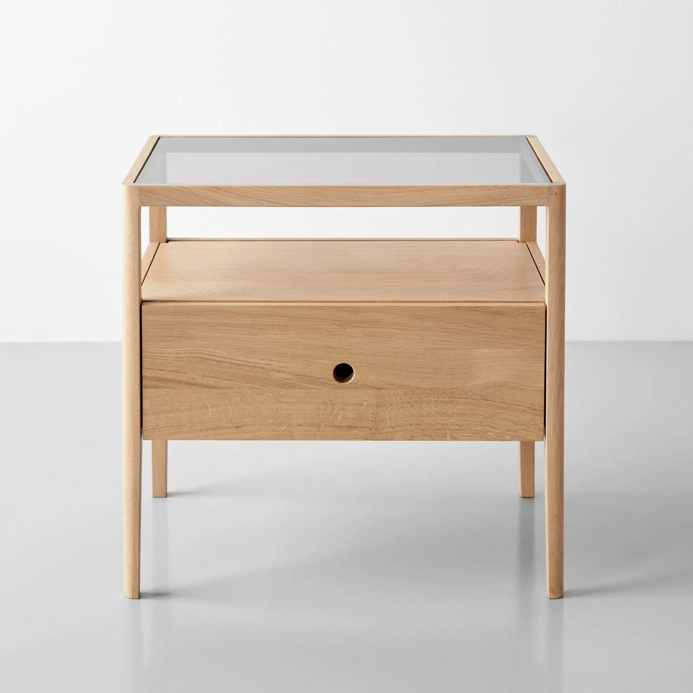 A modern classic at your side. Make a statement with a white oak nightstand that makes a distinguished presence with clean lines, straightforward functionality and natural wood grain beauty. It has a glass top and simple drawer to cache away all of your nighttime necessities. Along with being an ideal bedside piece, it works as a side table in your living room. Consider it the well-crafted supporting player any space needs.
